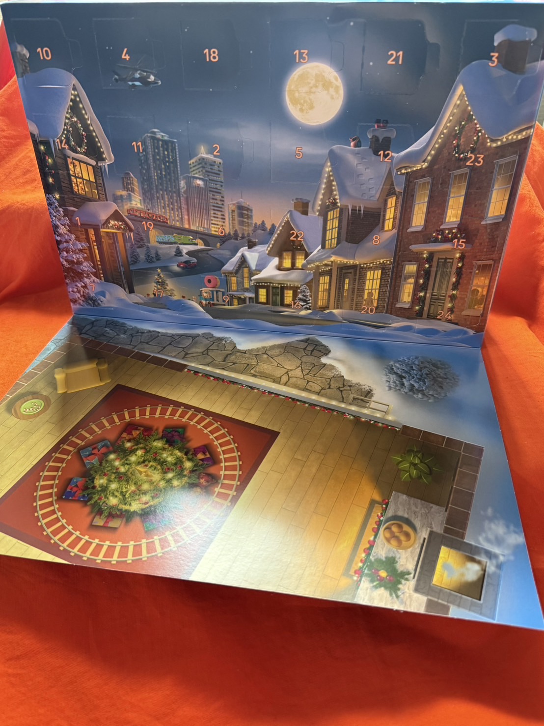 箱の表紙を開けると、24日分の小さな窓がずらり。さらに、その開いた部分がプレイマットになっていて、クリスマスパーティー会場として遊べるようになっていました。この仕掛けがまた、親子のテンションをぐっと上げてくれます。