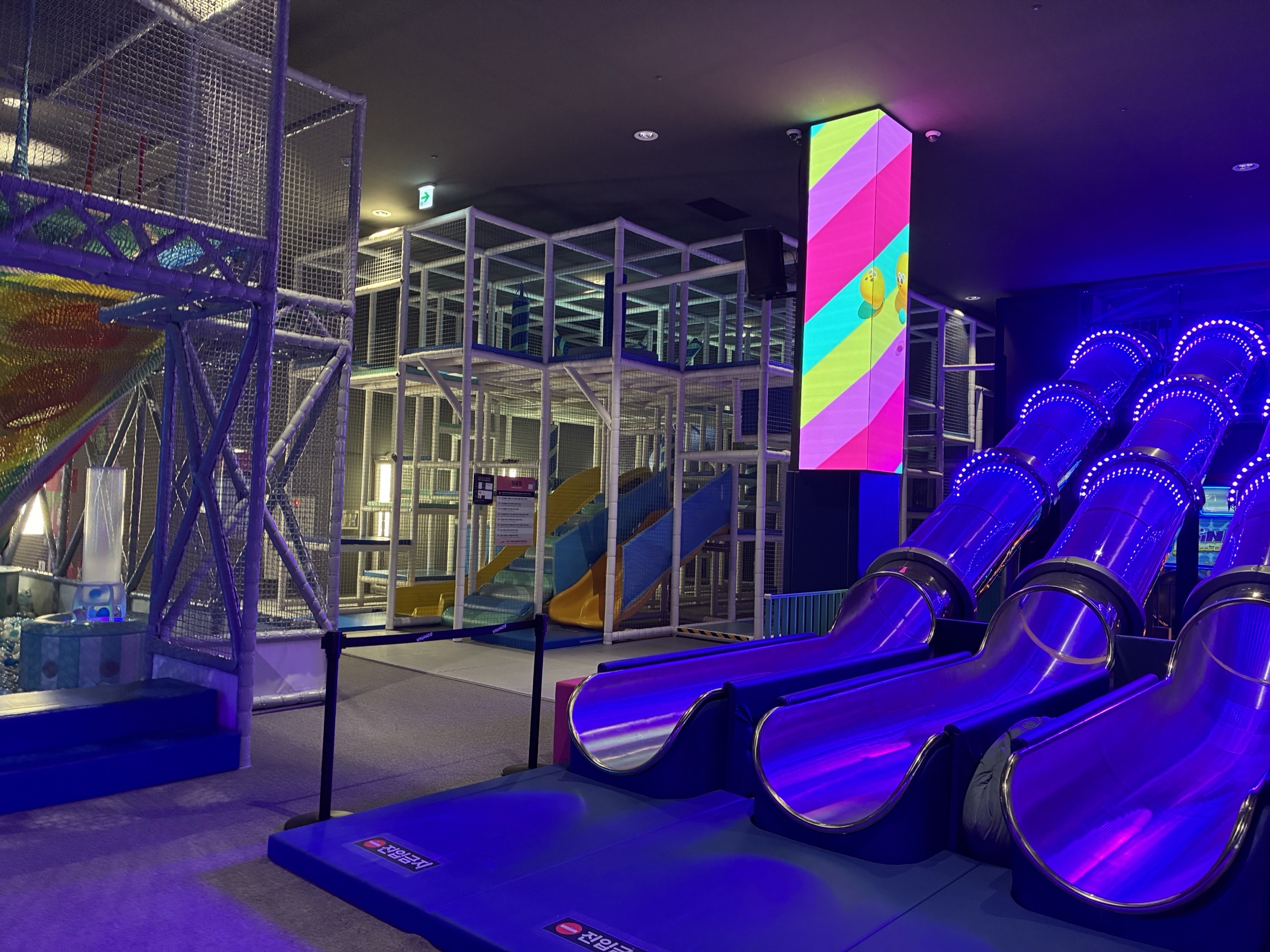 エンタメ性がありネオンライトも変わっていくので、滑るタイミングではまた別の遊び場にも感じられるほど。同じ滑り台でもまるで違った雰囲気が味わえるので、何十回も滑り倒していました。