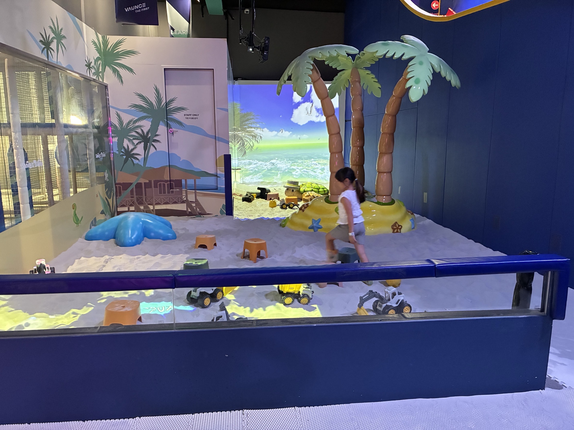 サラサラの気持ちの良い砂。デジタル映像が写されて追いかけるのに必死!ビーチにいるかのような作りに私も癒されました。
