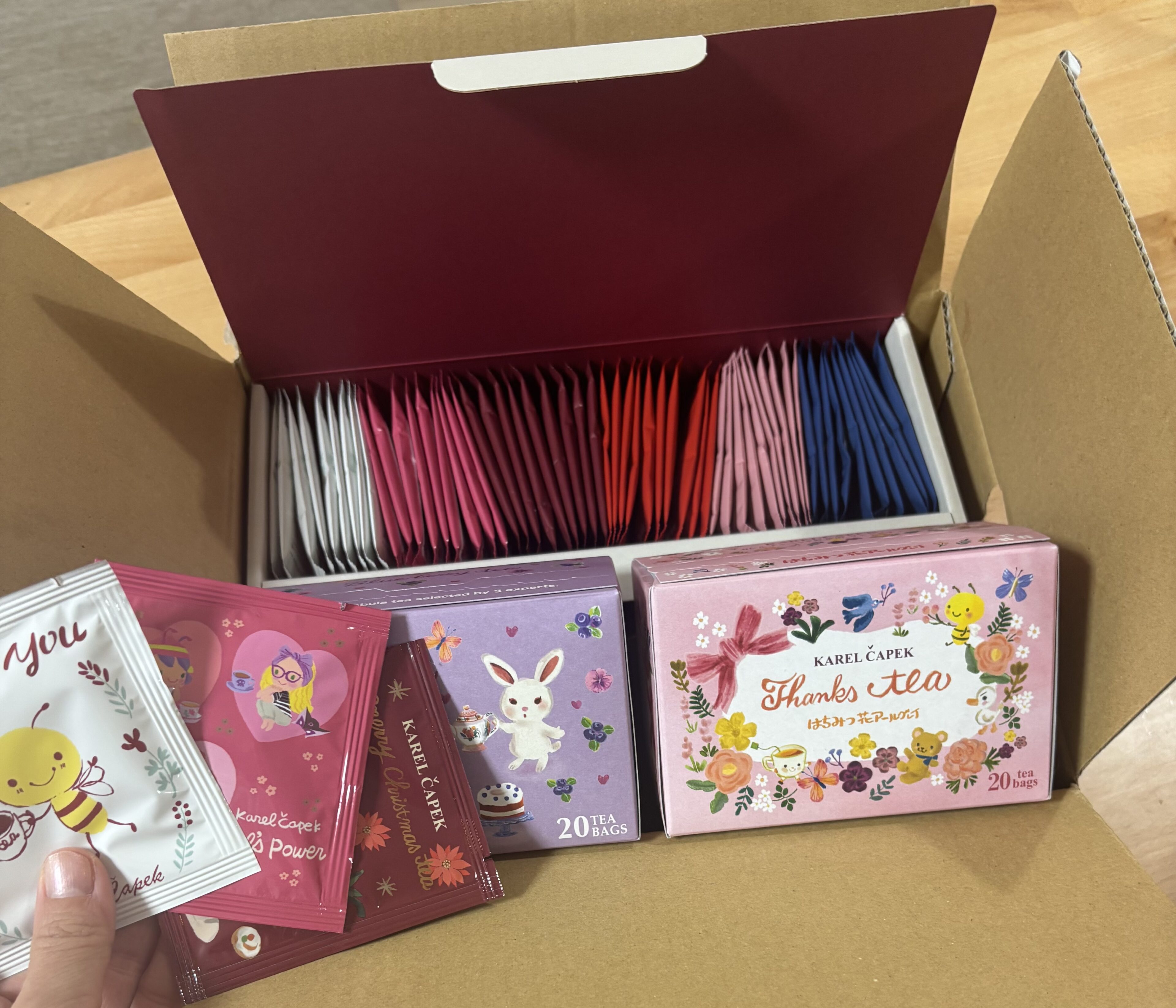 紅茶専門店のカレルチャペックならではの美味しい紅茶のティーバッグが100パックとコースターと卓上カレンダーが入っていました!