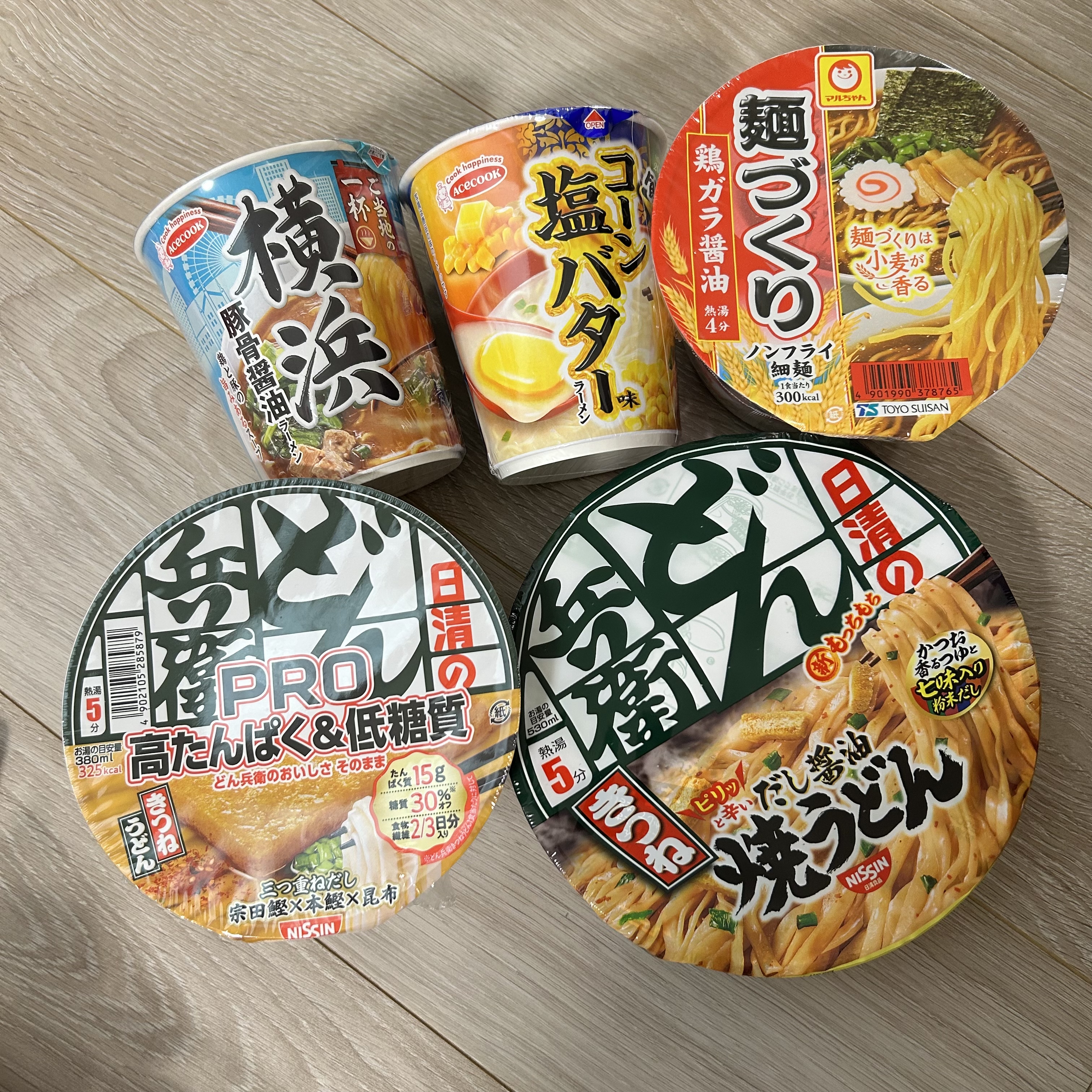 どん兵衛シリーズが2個入っているだけでもテンション上がるのに、麺づくり、コーン塩バターラーメン、横浜豚骨醤油と計5つも。