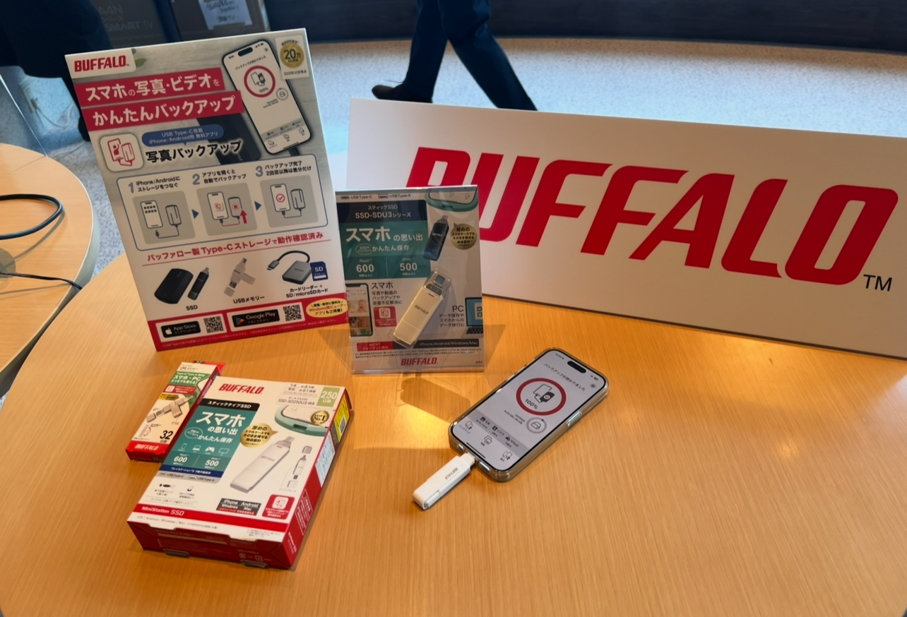 子どもの写真でスマホがいっぱいに…そんな経験はありませんか?USBメモリーで知られる「バッファロー」の展示では、写真をスマホから保存できる「写真バックアップ」アプリが紹介されていました。簡単に写真のバックアップができるので、容量不足の悩みがぐっと楽になりそうです。お土産もいただいたので、さっそく使ってみます。