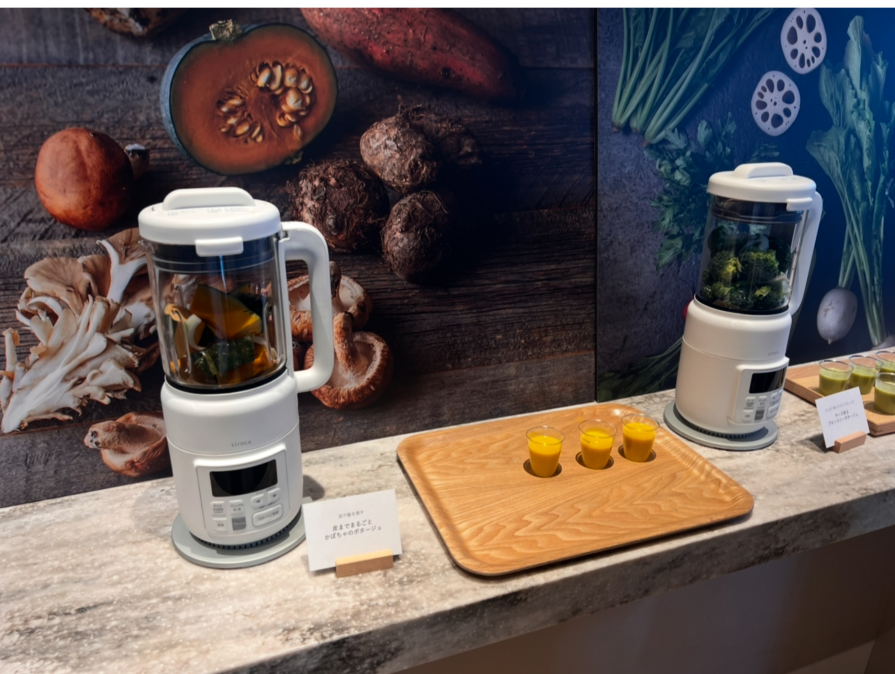 家電ブランド「シロカ」からは、新商品「おうちシェフブレンダー」が展示されていました。野菜たっぷりの温かいスープはもちろん、ホットにもアイスにも対応でき、ホットスムージーや離乳食作りまでこれ1台で簡単に仕上がります。試飲コーナーではスープやホットスムージーをできたてで楽しめました。「おうちシェフブレンダー」が当たる抽選企画もあり、なんと当選!近日中にレビューします。