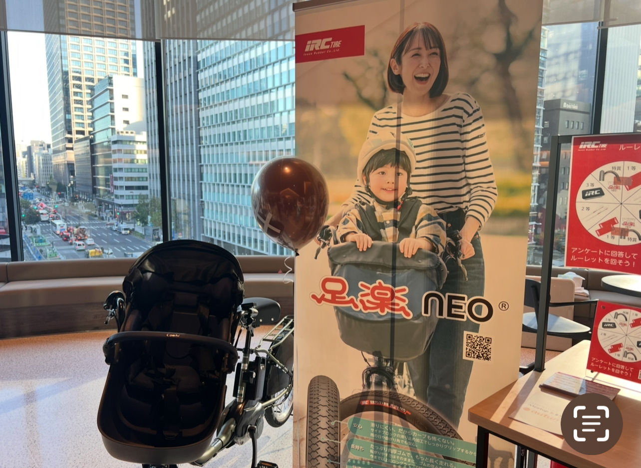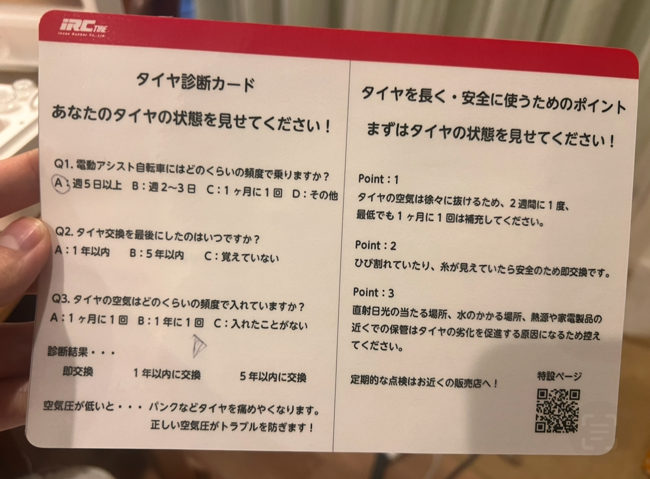 タイヤ・チューブメーカーとして知られる「井上ゴム工業」のブースには、電動アシスト自転車向けに開発された高性能タイヤ「足楽neo(あしらくネオ)」が並んでいました。みなさんは月に1度、空気を入れていますか?私は子どもの送迎で自転車を使っていますが、購入してから一度も入れておらず…反省しました。イベントでは、タイヤの状態を診断できるシートを使った質問コーナーもあり、「足楽neo」やオリジナルグッズが当たる抽選会も行われていました。