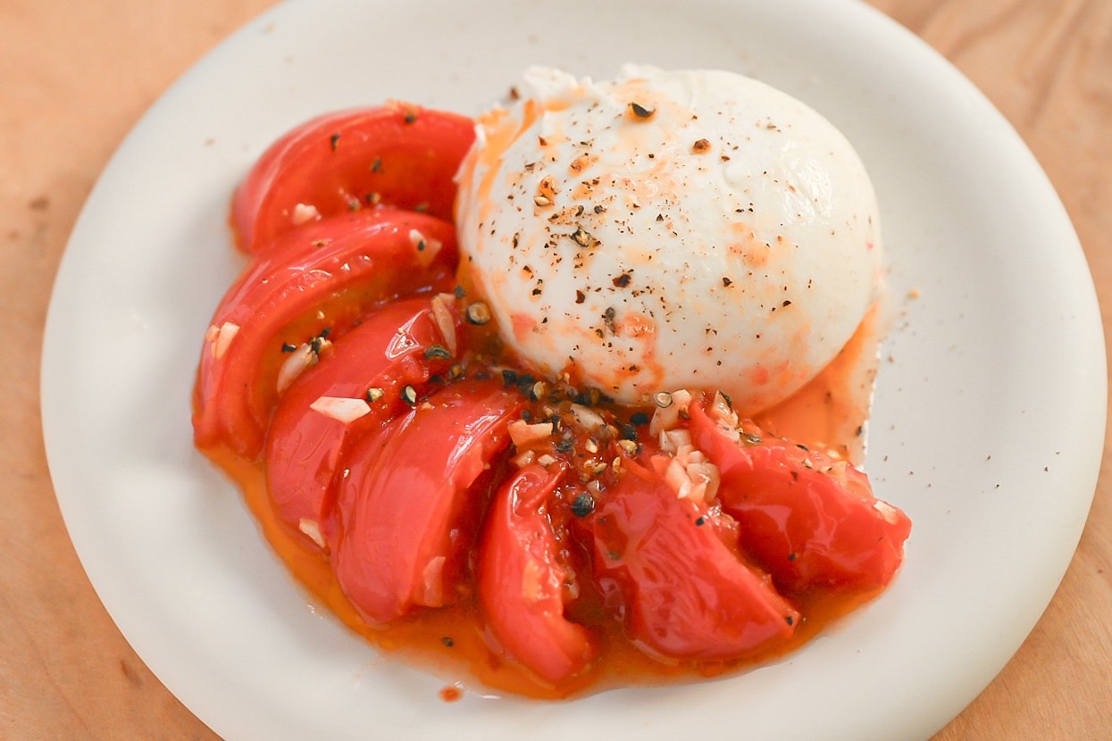 5. 皿にブッラータ、トマトをのせ、フライパンに残ったオイルと粗挽き黒こしょうをかけて完成。