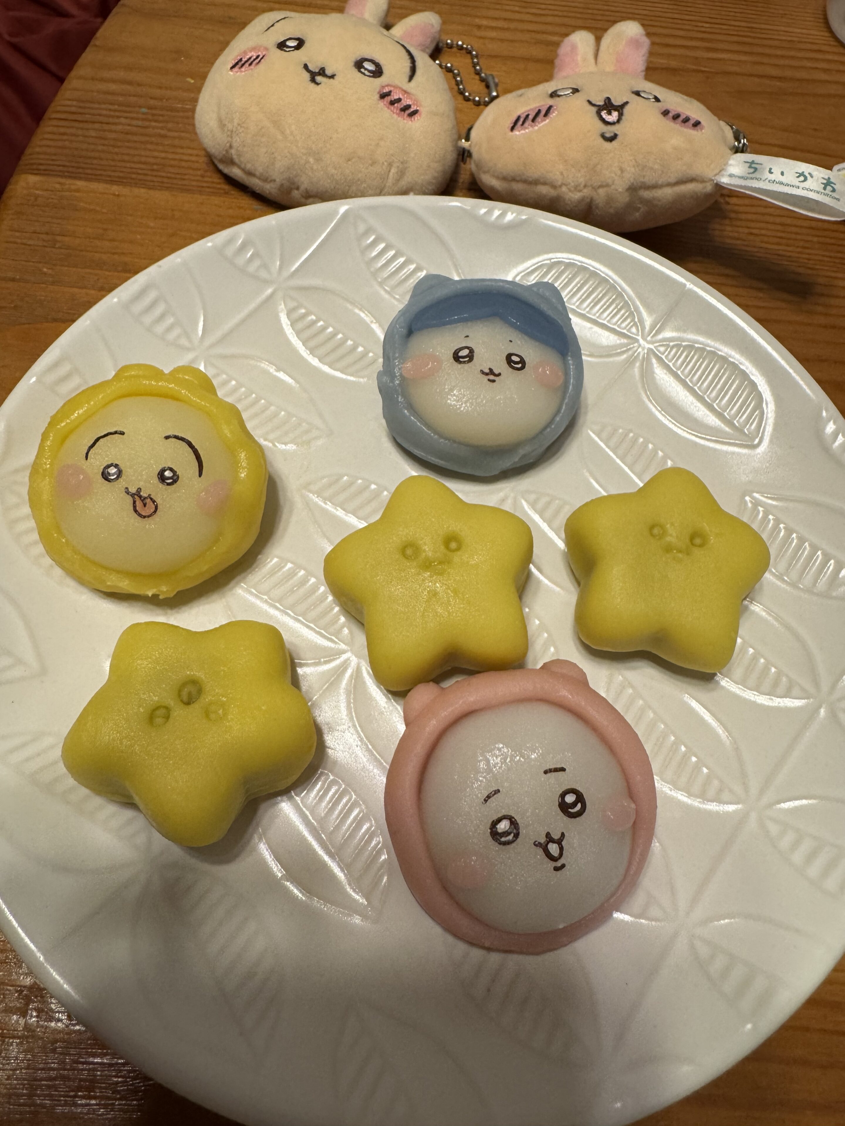 中身の餡は「ちいかわ」がいちご餡、「うさぎ」がミルクティー餡、「ハチワレ」がミルク餡で、「星」は全て同じこし餡です。