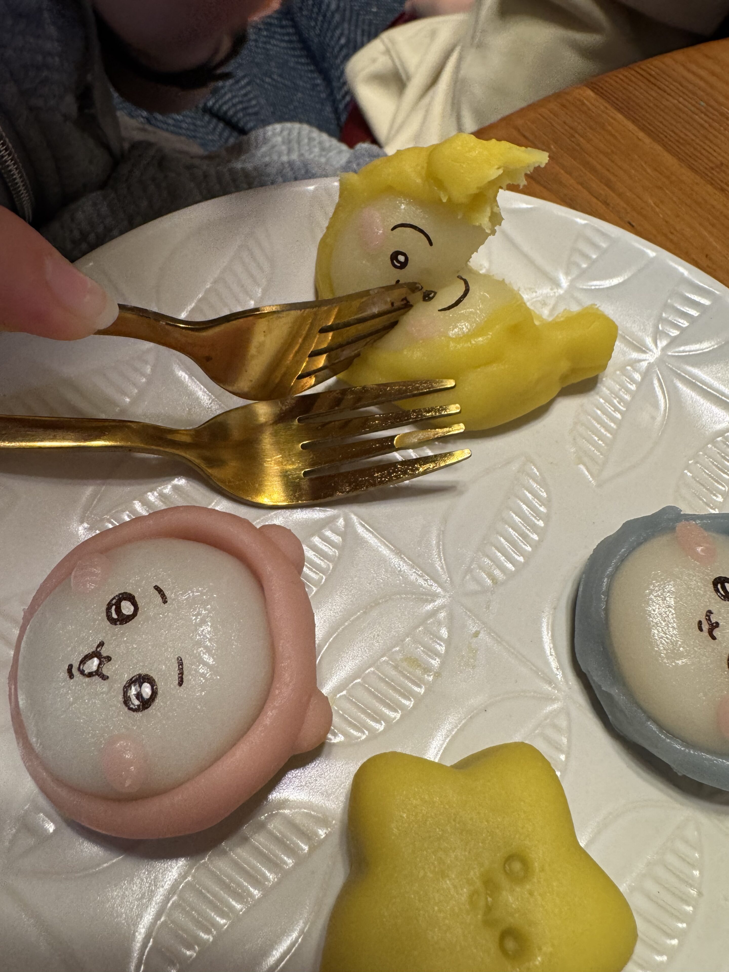 「食べるのがもったいなーい!可哀想!」と言いながらも、思い切って真っ二つにされるちいかわ達でした(笑)。