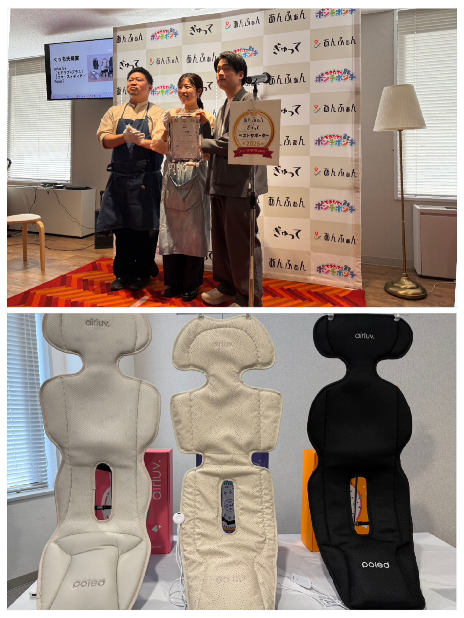 こちらはベビーカーやチャイルドシートに取りつける送風機付きのクールシート。実際にぐっち夫婦がご友人から出産祝いとして贈られて大変重宝したとのことで、今回受賞されました。実際にスイッチを入れてみると、優しいそよ風がたくさんの小さな穴から出てきました。さらに送風機の音も気にならず、子どもの睡眠を妨げる心配もなし。日本の夏が暑すぎるのと、近年は10月まで夏日なんて当たり前。そんな暑さのせいで、わが家の親子外出はめっきり減ってしまいました。息子がベビーカー乗りだった時期にこんな快適なアイテムが欲しかったです!「airluv.4+」は日本限定で保冷剤ポケットや新色が加わってよりアップデートしたタイプ。ぐっち夫婦のTatsuyaさんが、クールシートを取り付けたベビーカーに乗る息子さんを「俺もこれに乗りたい」と羨ましがるのも納得でした。