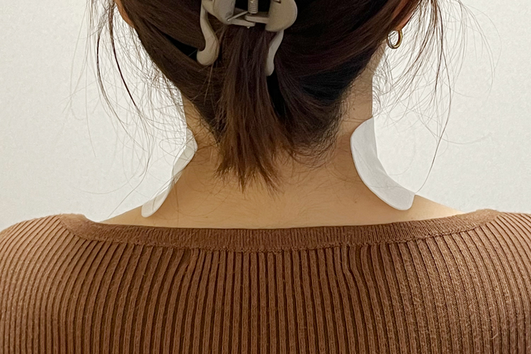 シートは首の前側を集中的にケアするタイプなので、うなじまでは覆いません。髪が触れると粘着力が落ちてしまうため、アップスタイルで使用するのがおすすめです。