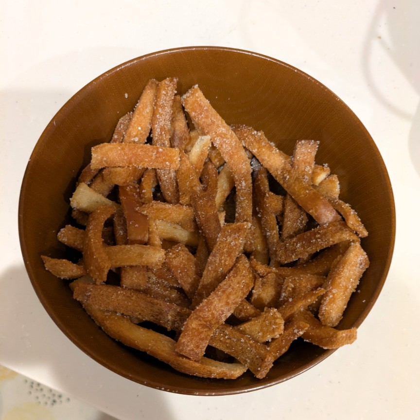 上記にさらっと記載しましたが、作り方はパン耳をそのまま油で揚げて砂糖をまぶすだけ。(説明が一行で終わる調理工程、ズボラ母にはもってこいです)