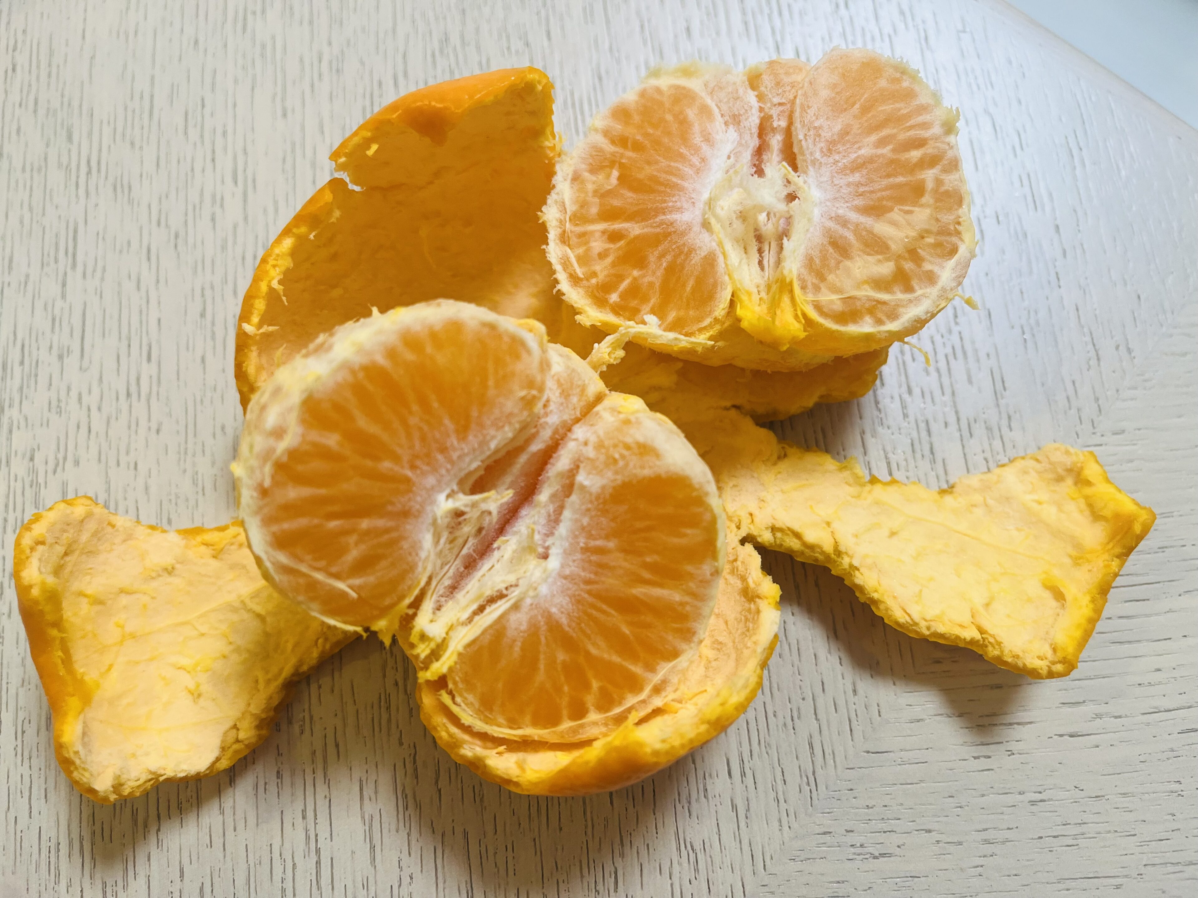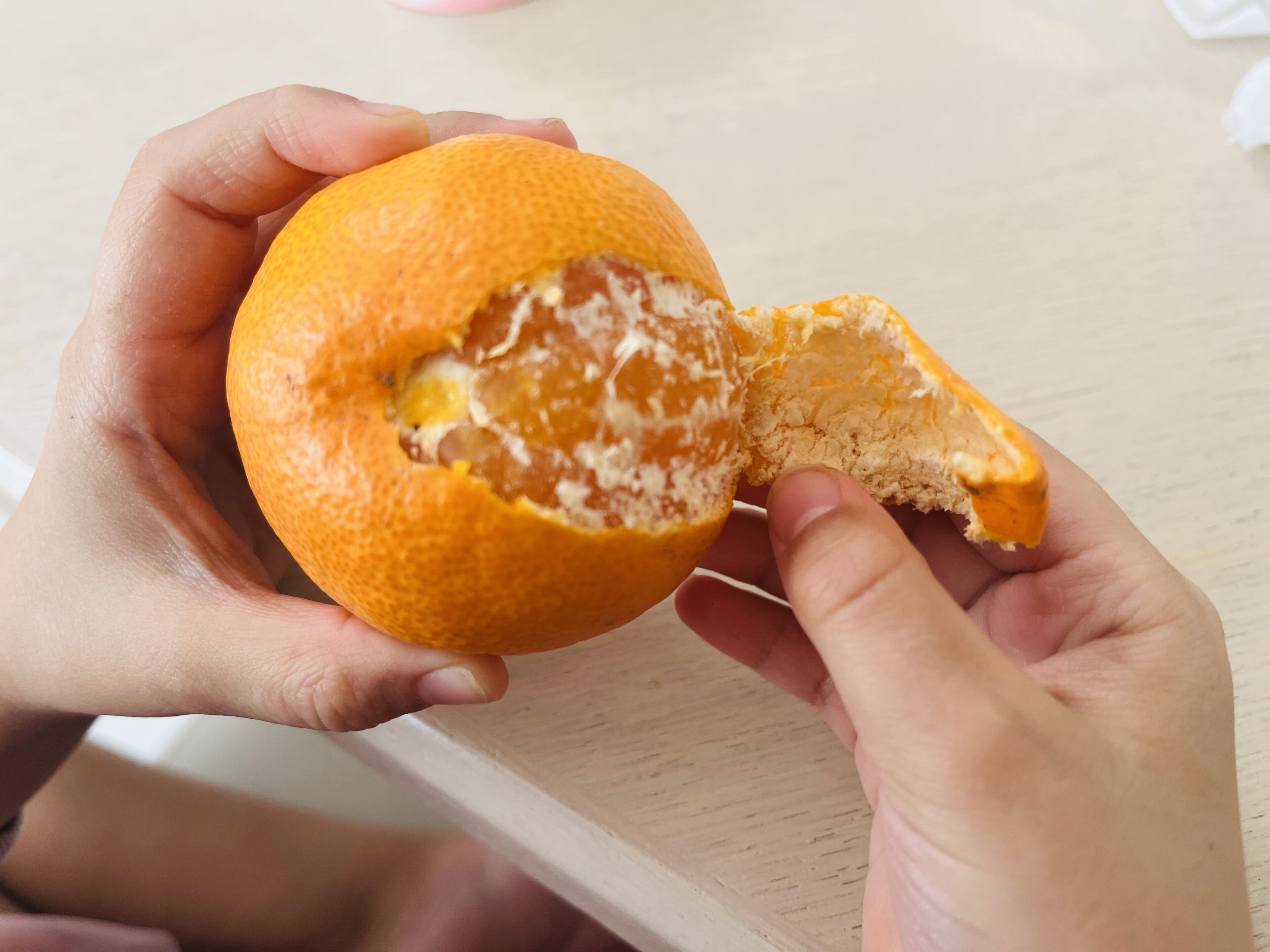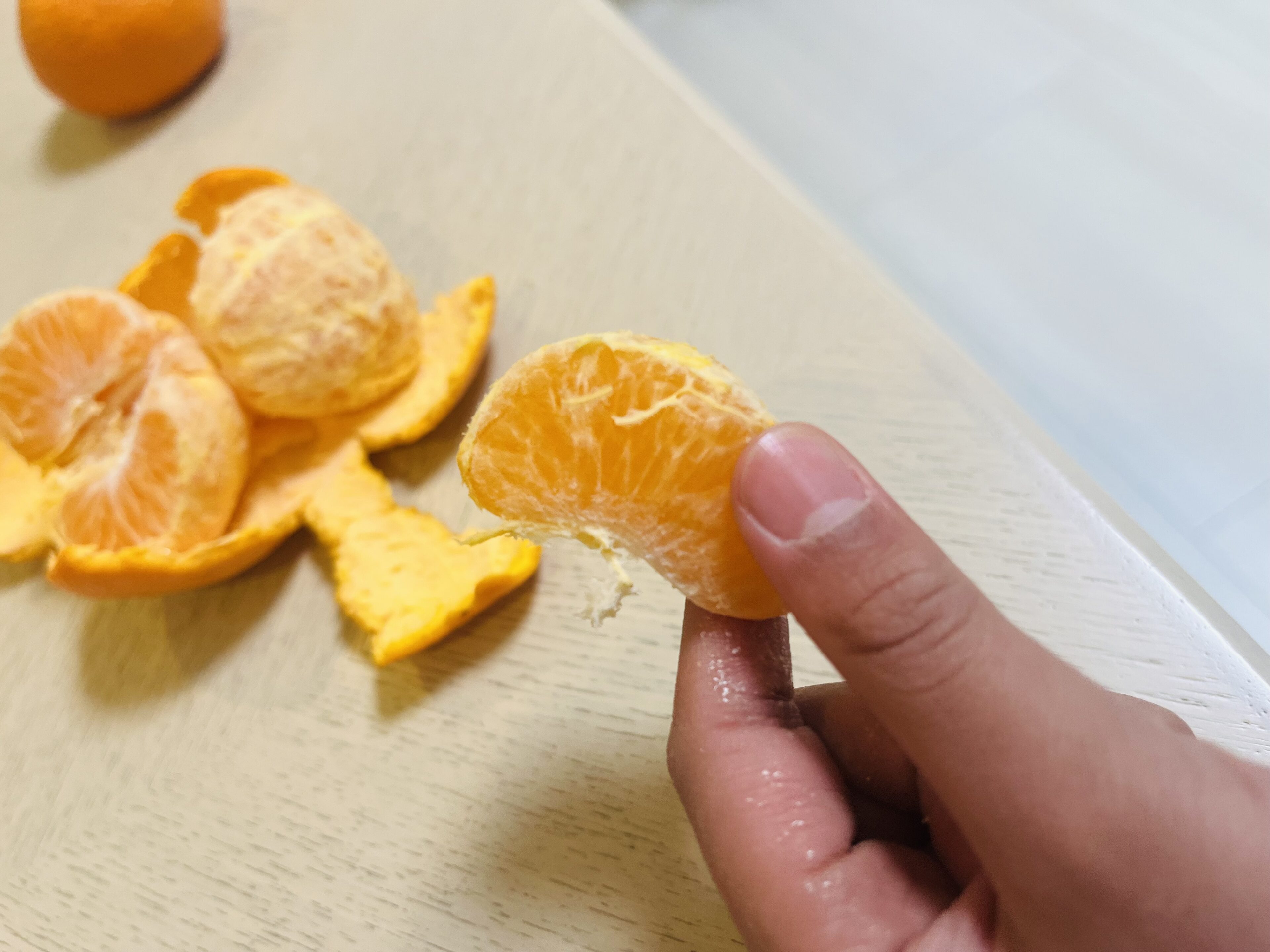 見た目はオレンジのようなツヤのある皮ですが、実際は手でもスルッとむける扱いやすさがあります。5歳の次女も難なく1人でむくことができていました。