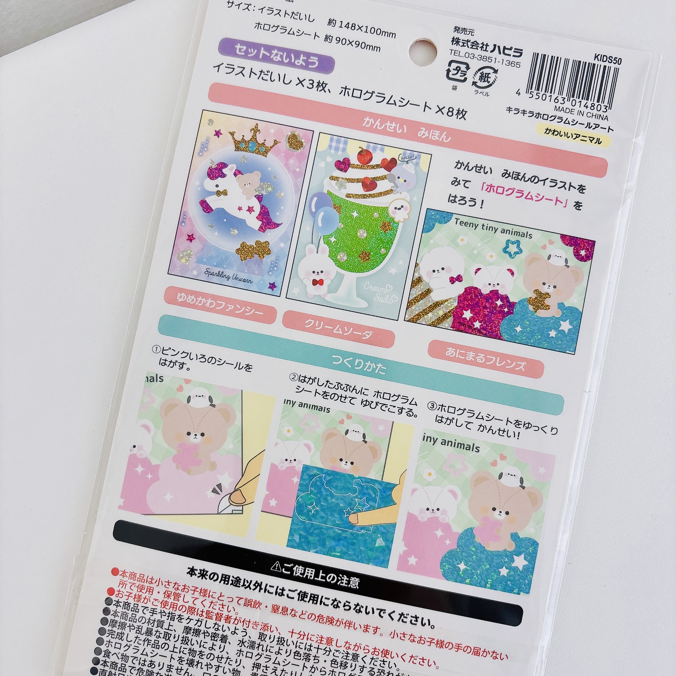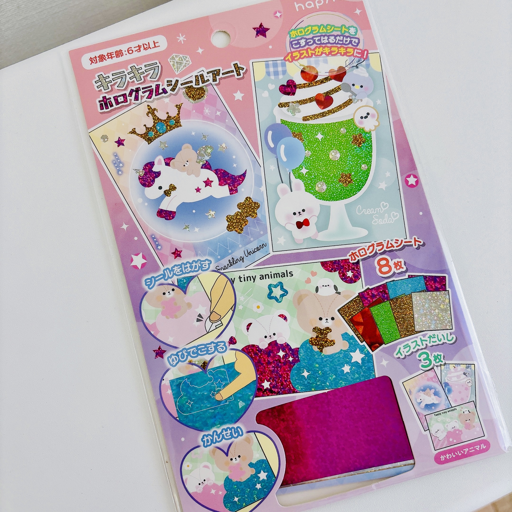 絵の描かれた台紙のシールを剥がし、ホログラムシートを載せて指でこするとキラキラに!とてもかわいいイラスト台紙がなんと3枚入り。ホログラムシートも8枚入っていて110円(税込)!色も柄も豊富で選びながら完成させるのも楽しめそうです。こちらは、道具も不要なので、新幹線の中などでも遊べると思います!すごくかわいいので完成したら飾るのも素敵。