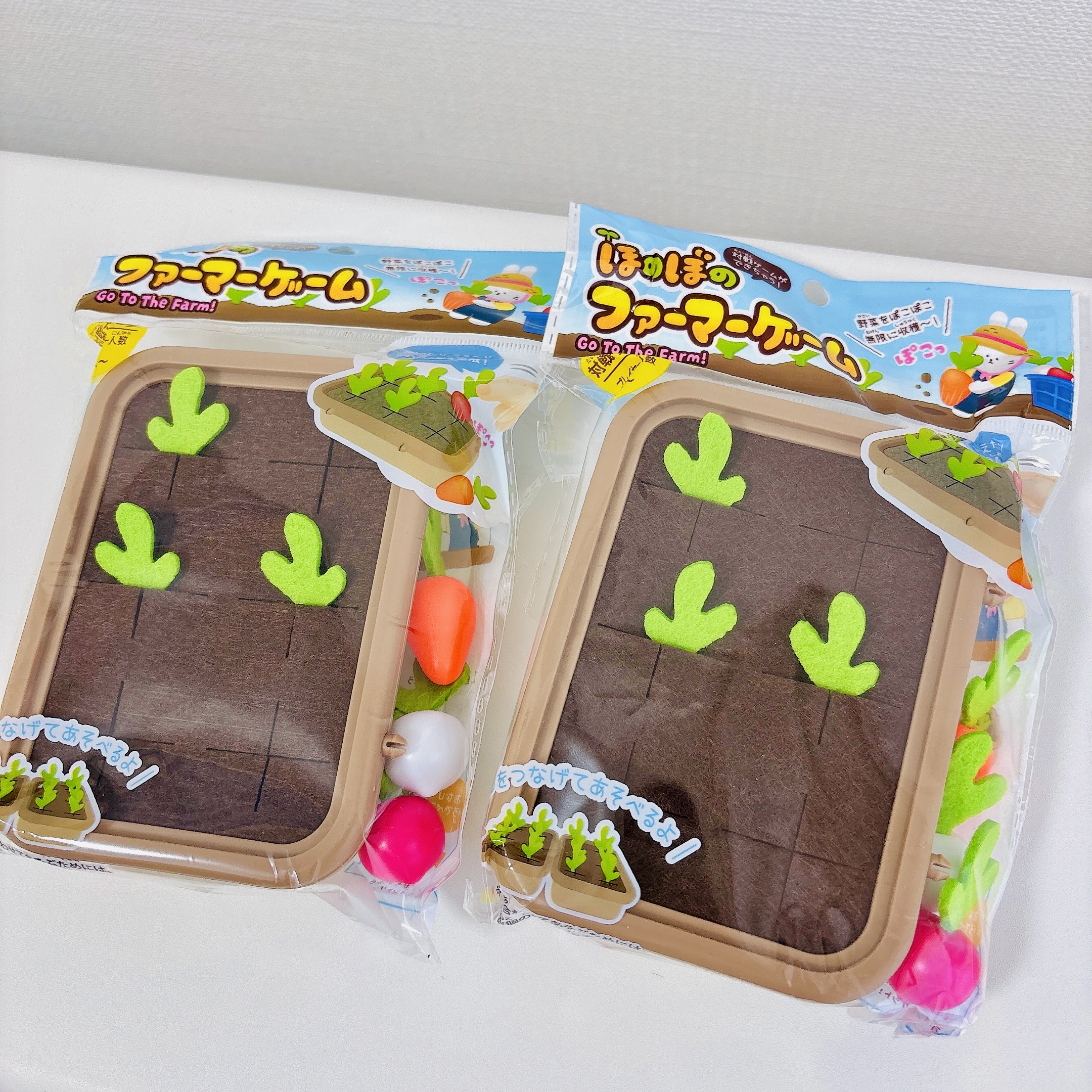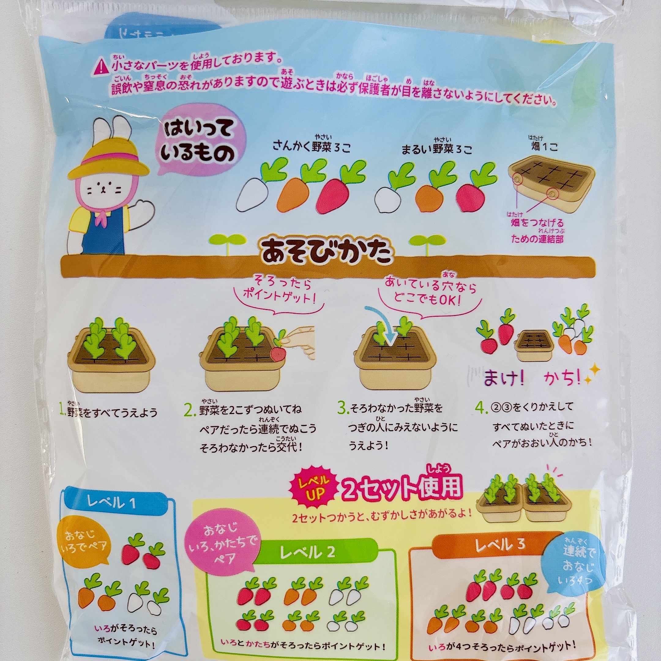 とにかく見た目がかわいいこのおもちゃ!私が気に入って即買いしたものです。畑が1個、三角の野菜と、丸の野菜が色違いで三つずつ入っています。遊び方は、畑にランダムで6つの野菜を植えます。順番を決めて2個ずつ抜きます!同じ色の野菜が抜けたらペアなので続けて抜くことができます。揃わなければ次の人に交代。神経衰弱と同じ要領です!我が家は2セット購入したので、2セットだと数も多くなりより楽しめそう!そして、トランプの神経衰弱と違うのは引っこ抜く!これがやみつきになっちゃうんだとか!じじばばとやっても楽しそうです~!