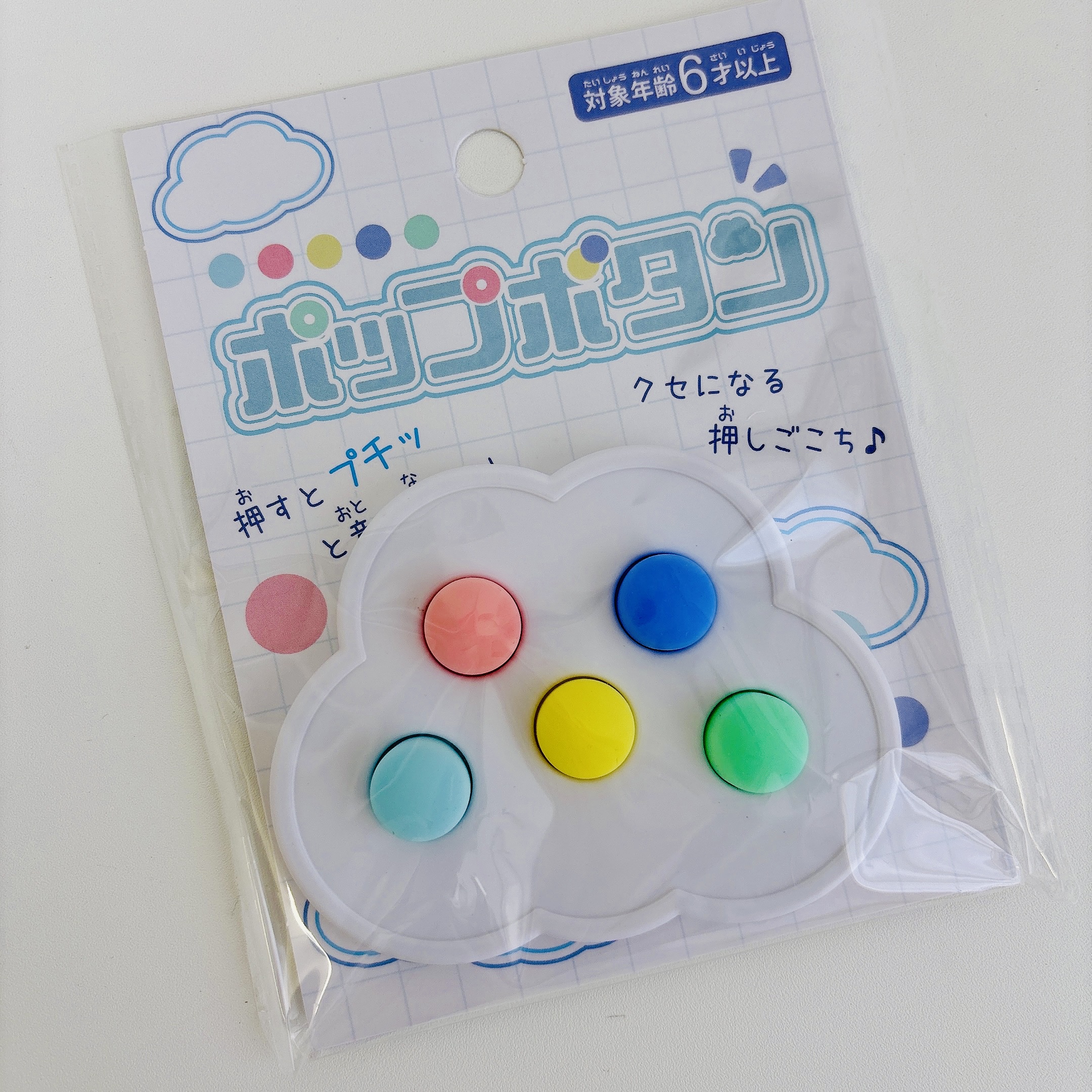 特に新幹線や車など移動時にちょっとした暇つぶしになりそうなおもちゃがこの二つ!一つ目は、【ポップボタン】です。押し心地がなんともクセになる感触!プチッ!とプッシュポップのような触って遊ぶおもちゃです~。形もかわいくて、持ち歩きも便利です!
