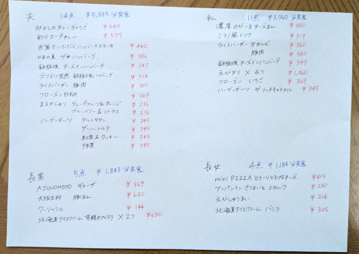 一家四人で34点、12122円分を完食しましたー!(素人調べなので多少の誤差はもちろんあると思います)