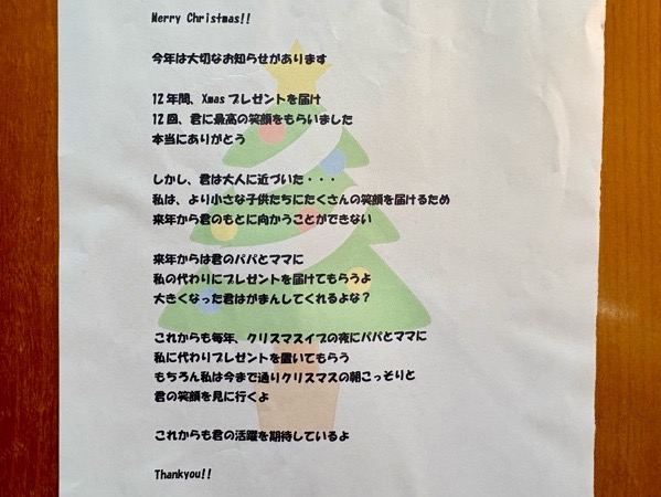 そして迎えた6年生のクリスマス。枕元にプレゼントとサンタさんからの手紙が。