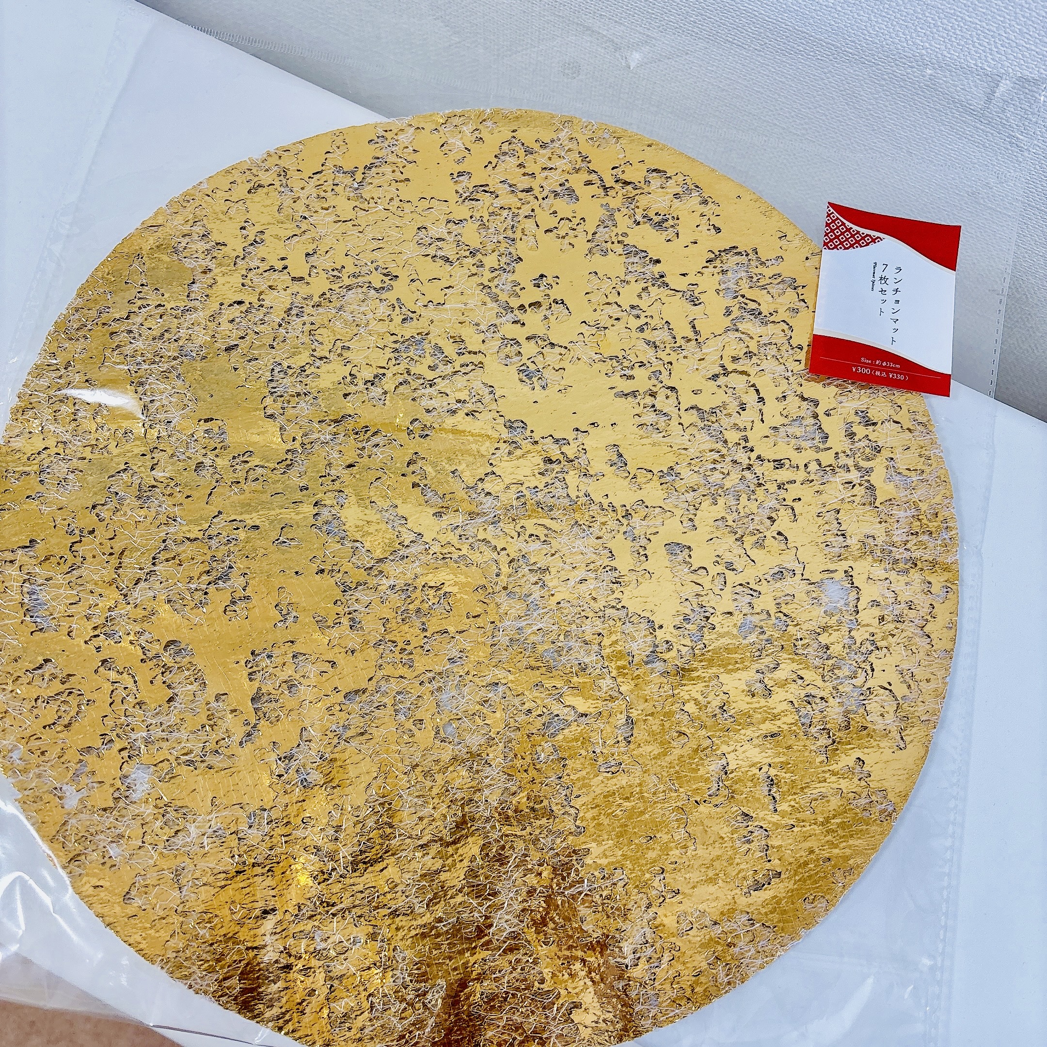 高見えで映え~なスリコのランチョンマット!7枚入りで330円(税込)。金箔のようなキラキラ感でゴージャス。敷いてみると一気に正月の雰囲気が漂います。薄いので取扱注意ですが、飾りを並べる下に敷いても素敵です!もちろんお正月のおせちなどを並べる際にも!