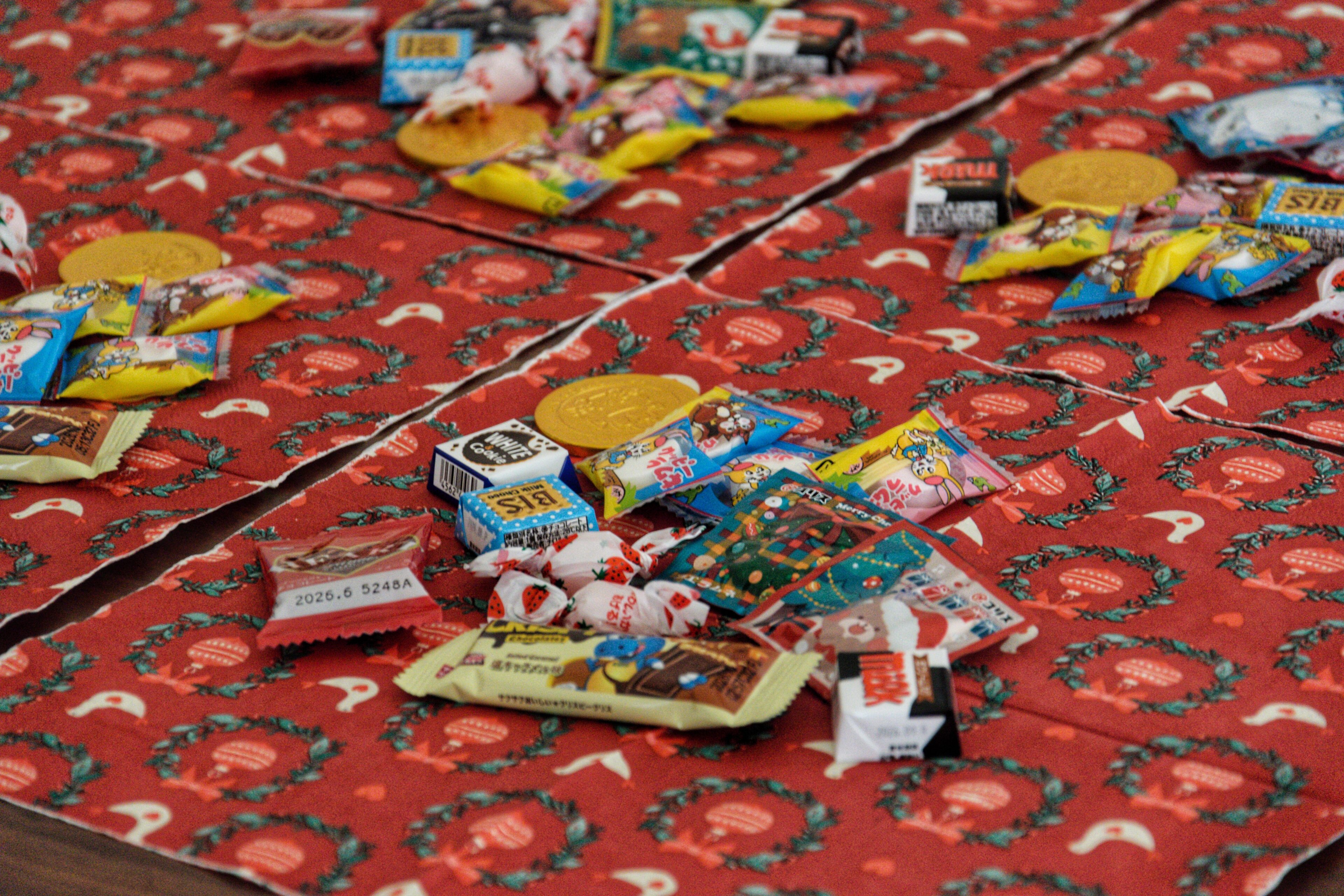ツリー作りの第一歩は、お菓子をテーブルに並べるところから。駄菓子やチロルチョコなど、軽くて貼りやすいお菓子がおすすめです。