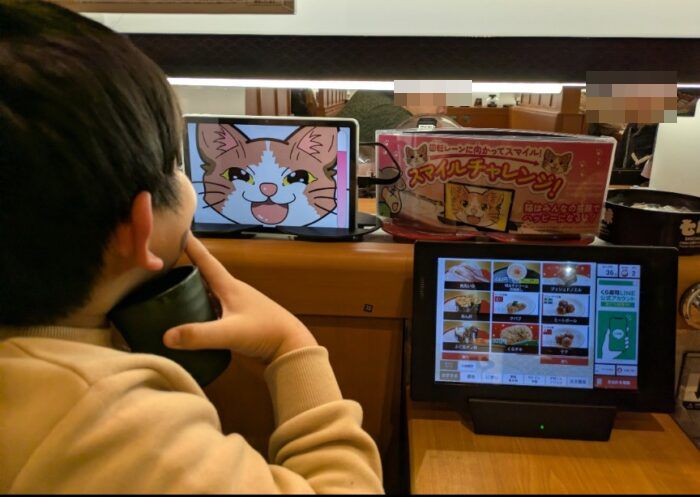 またスマイルチャレンジなるものもあり、回転レーンに流れてきた泣いている猫のタブレットに向かって微笑むと、猫が笑顔を感知して微笑んでくれ、運が良ければミニゲームにチャレンジできるキャンペーンも行われていました。