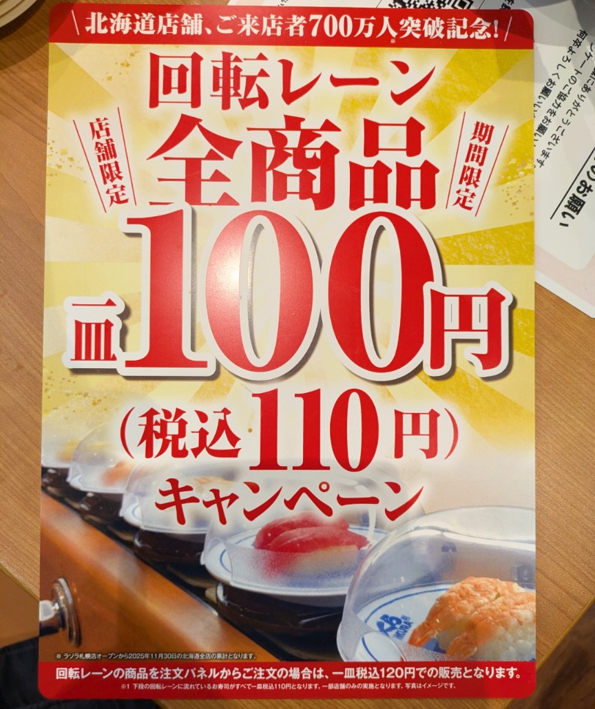 デザートであるスイーツに行く前にまずはお寿司をいただきましたが、今北海道のくら寿司では『回転レーン全商品一皿100円(税込110円)キャンペーン』なるものが開催されています。北海道店舗の来店者700万人突破を記念したキャンペーンだそうで、道内の店舗限定、期間限定の素晴らしいキャンペーン!