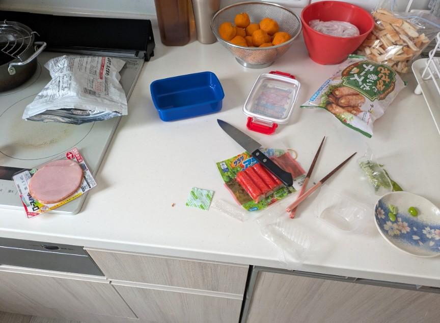 おかずはとりあえず片っ端から冷凍食品をレンジでチンして詰めることにして、主食になりそうなものを探す私。人間追いつめられるととんでもないことを考えるようで、原材料は小麦だし一応炭水化物のカテゴリーに入りそうだし、主食はこれしか今の我が家にはない!と決断し、アレを真っ二つに切って弁当に入れ、5分かからずに弁当完成。