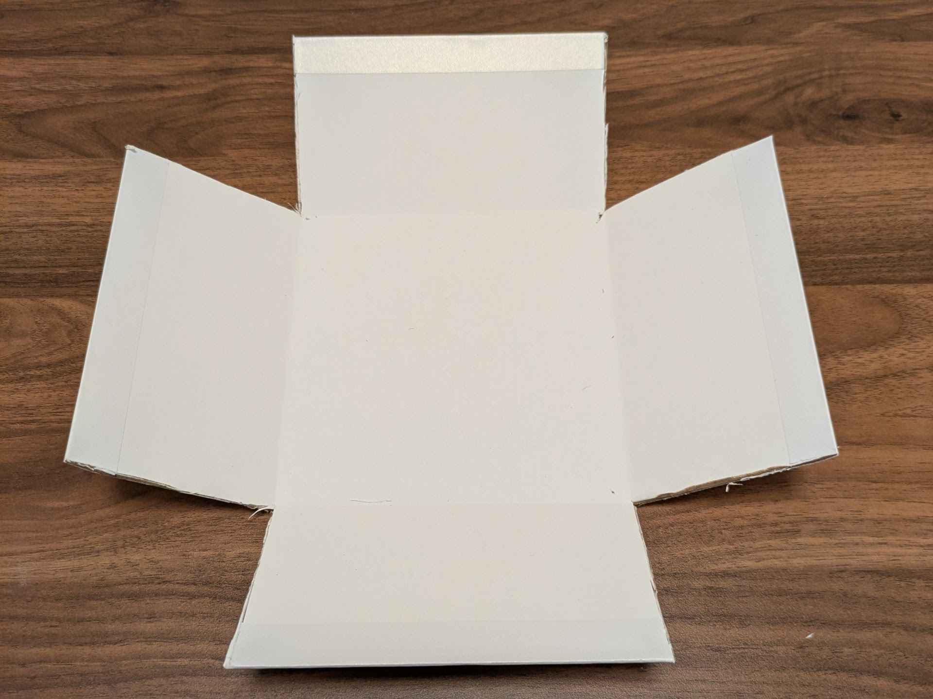 蓋を外し、箱部分の側面をはさみでカット。展開図のように平らにします。