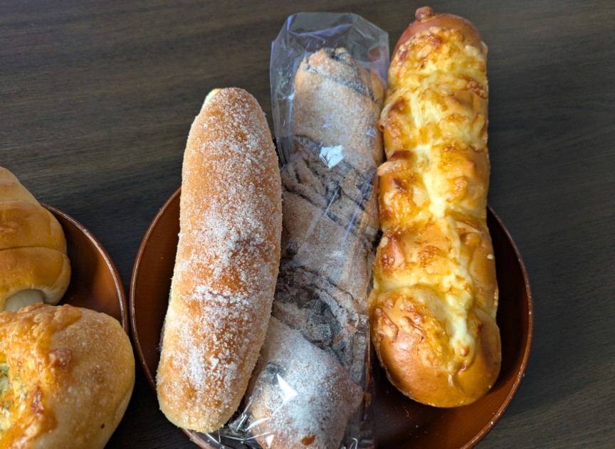 左は9歳長男が大好きな揚げパン(大好物すぎて1個じゃ足りないとのことで2個買いました)、右が新商品の4種のチーズのちぎりパン、中央がこちらも新商品のショコラスティックメロンパン。