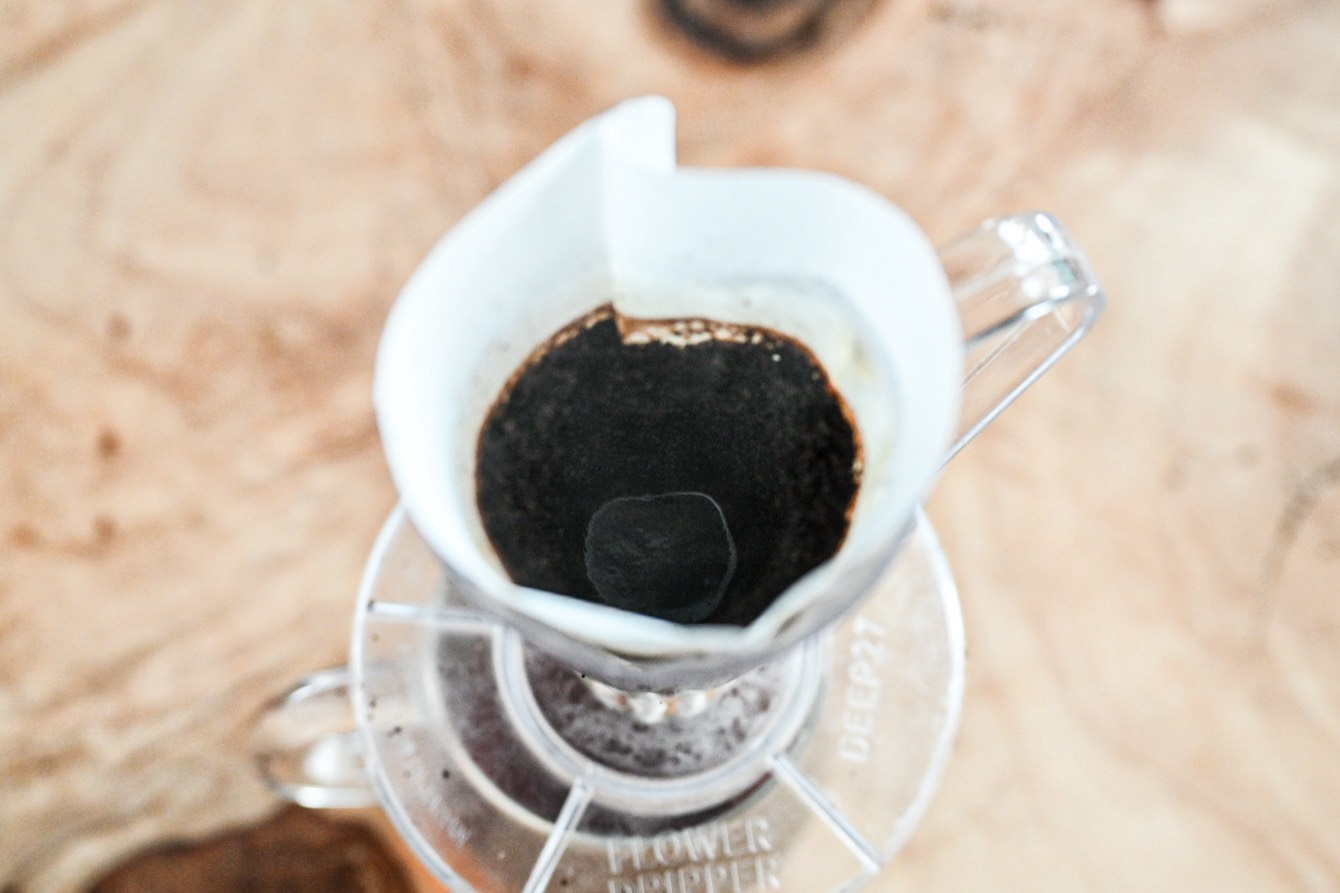 粉の倍量の湯をそっと注いで20秒待ち、細く静かに小さな円を描くように注ぎます。