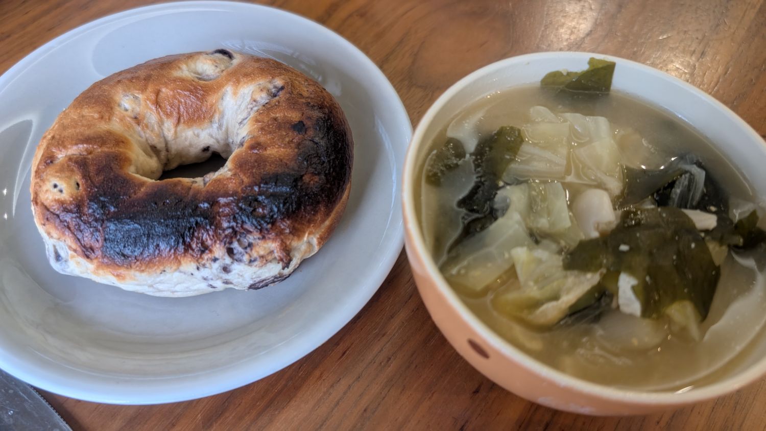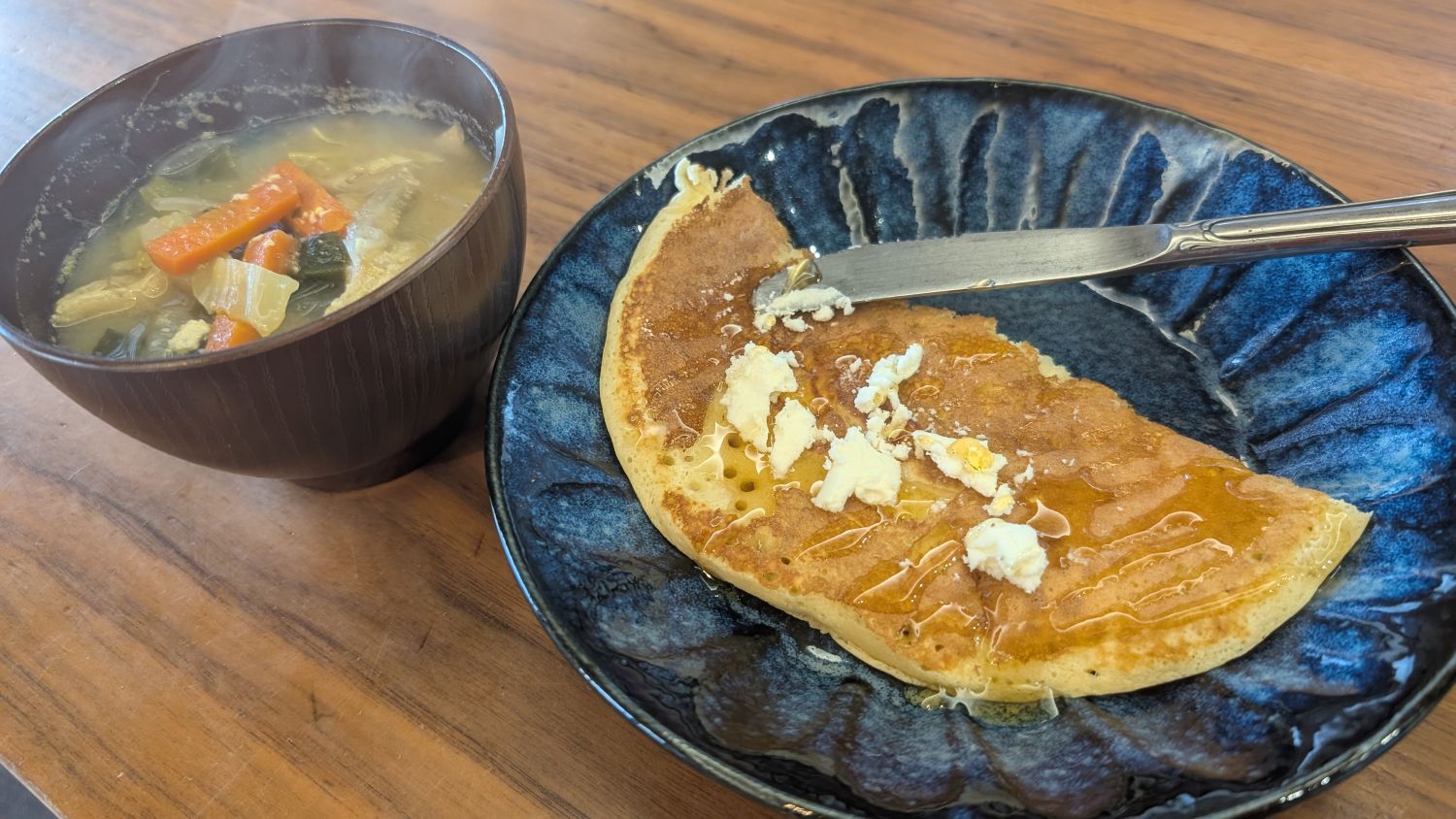 子どもたちにホットケーキを焼いたので、残りのホットケーキ+昨日の味噌汁。