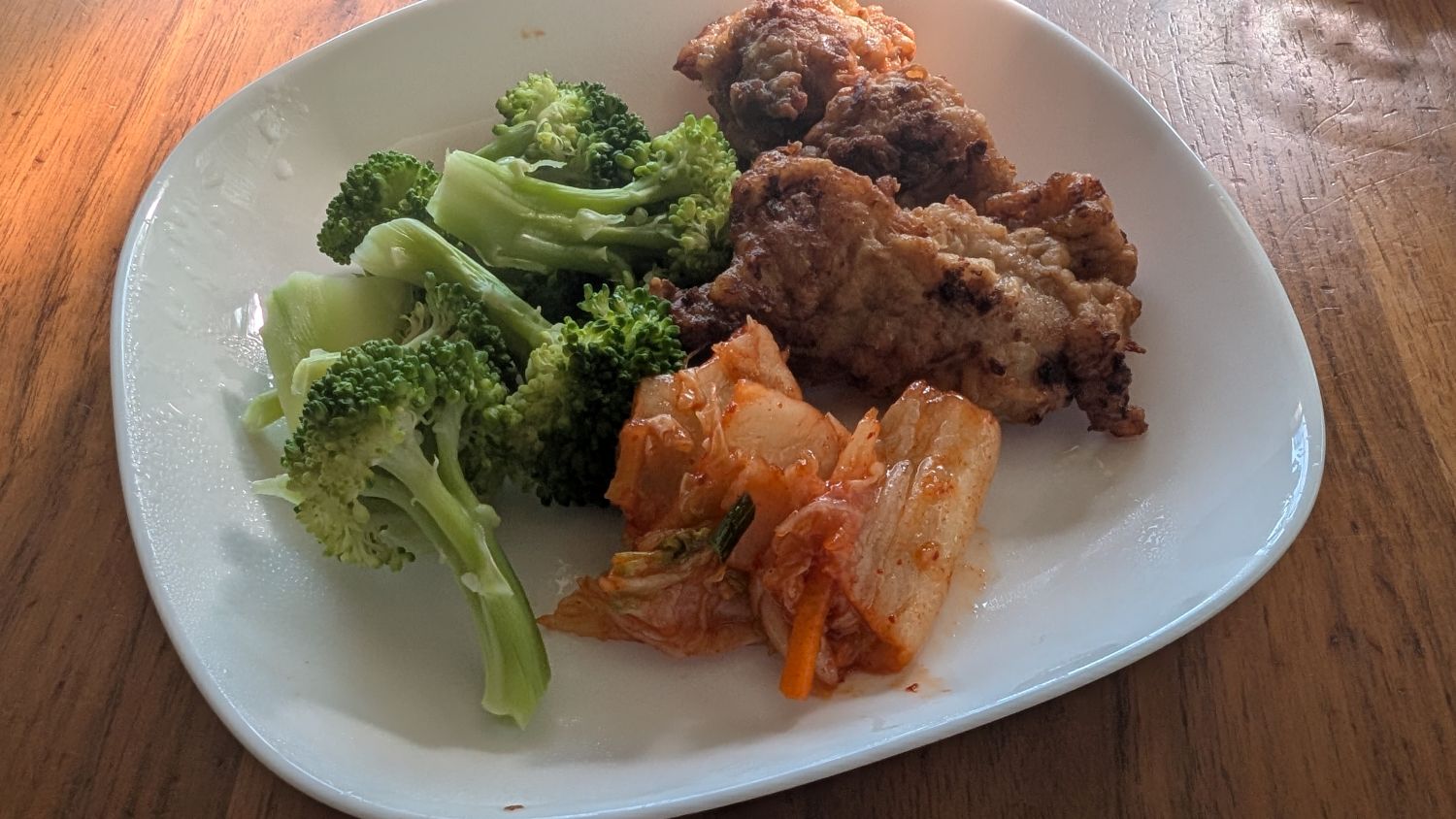 前夜のブロッコリーと唐揚げを温めなおして、ごはんと一緒に。