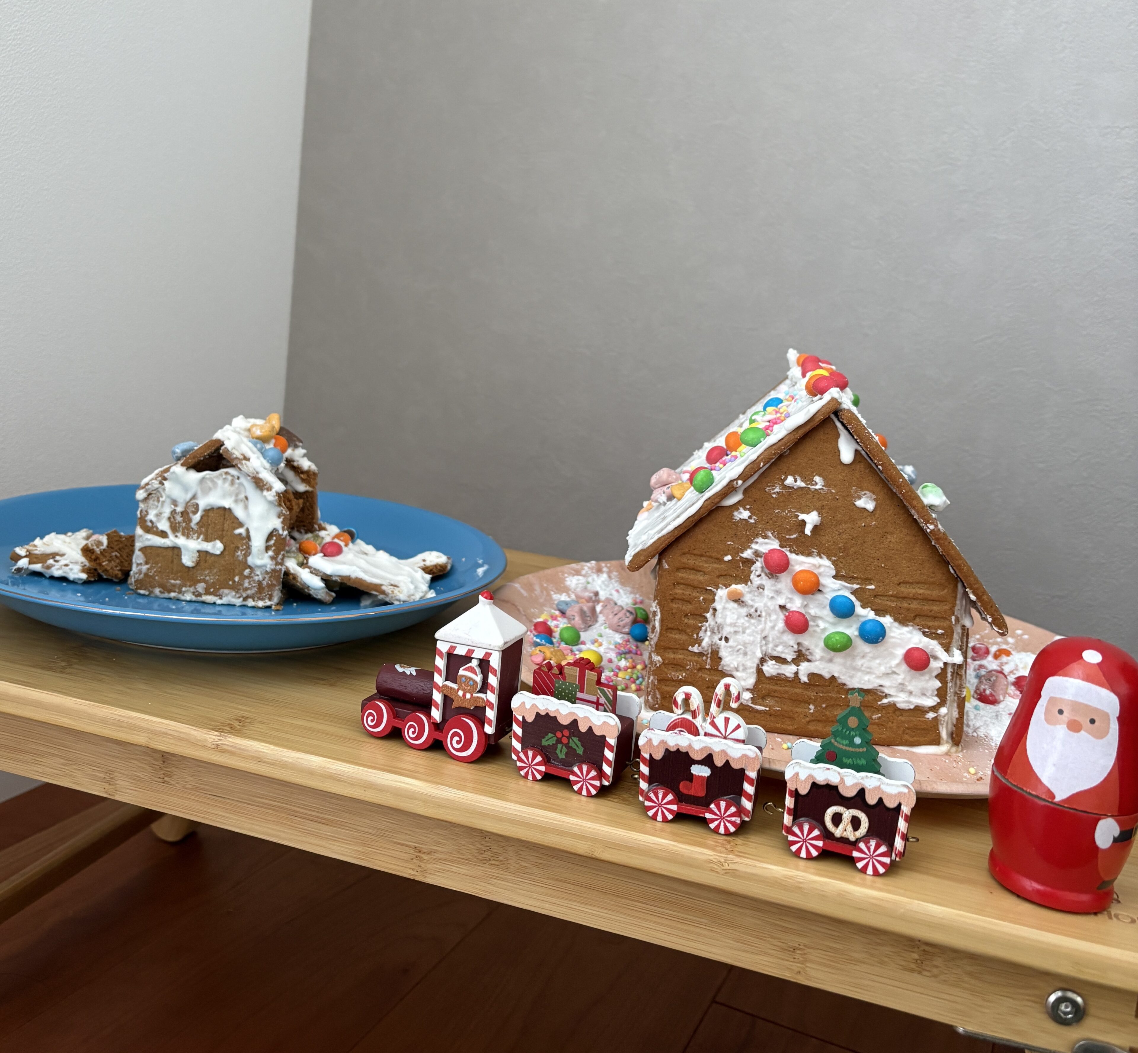私達は諦めなかった!!余ったクッキーをアイシングで強引に繋ぎ合わせ、なんとか「白川郷の合掌造り」のような、味のある小さなお家を1軒ひねり出すことに成功(笑)そして、バラバラになったクッキー達は、ベイクドチーズケーキの土台として代用!結果、クリスマスケーキも作れたから、それもヨシ〇。