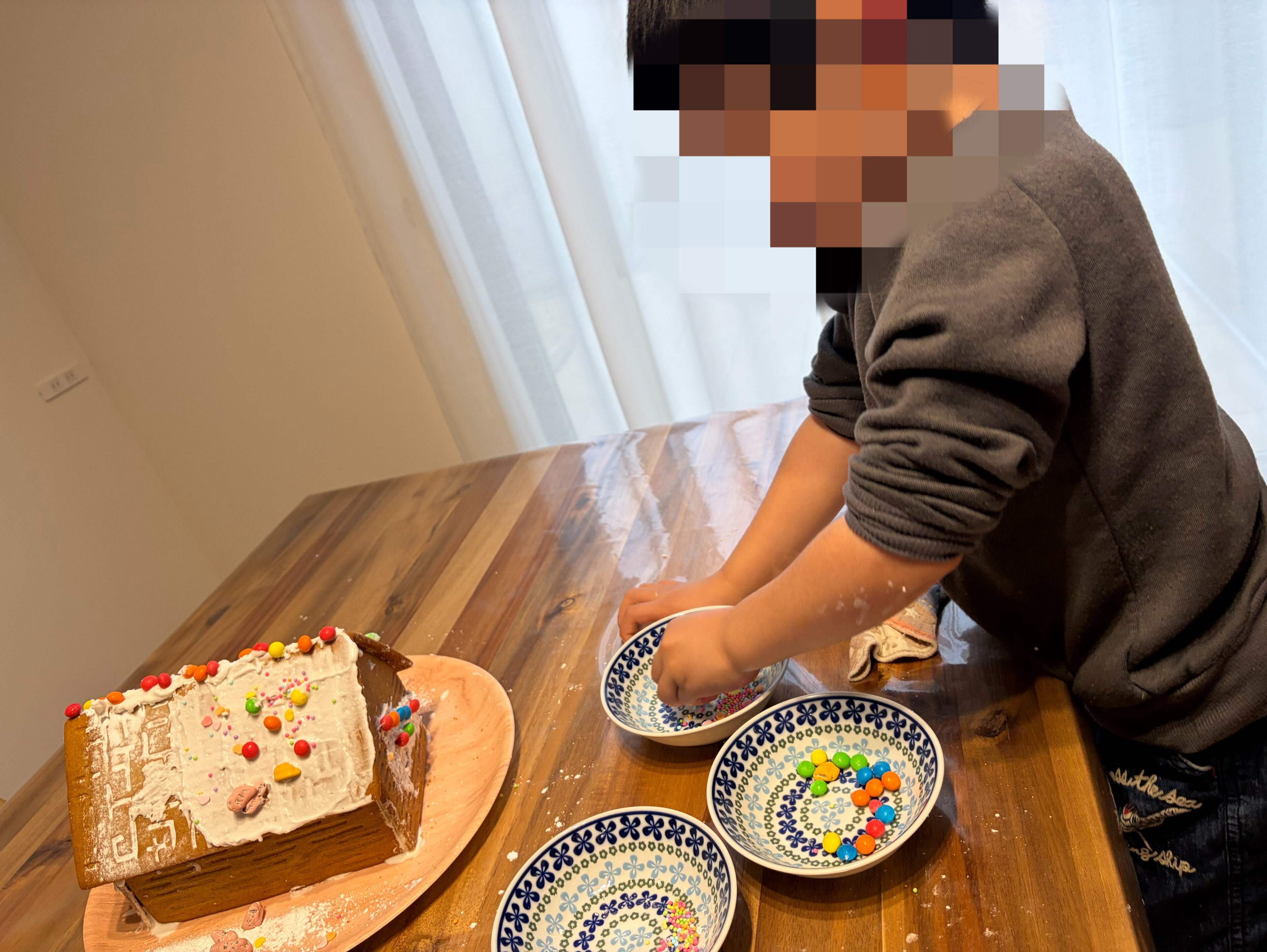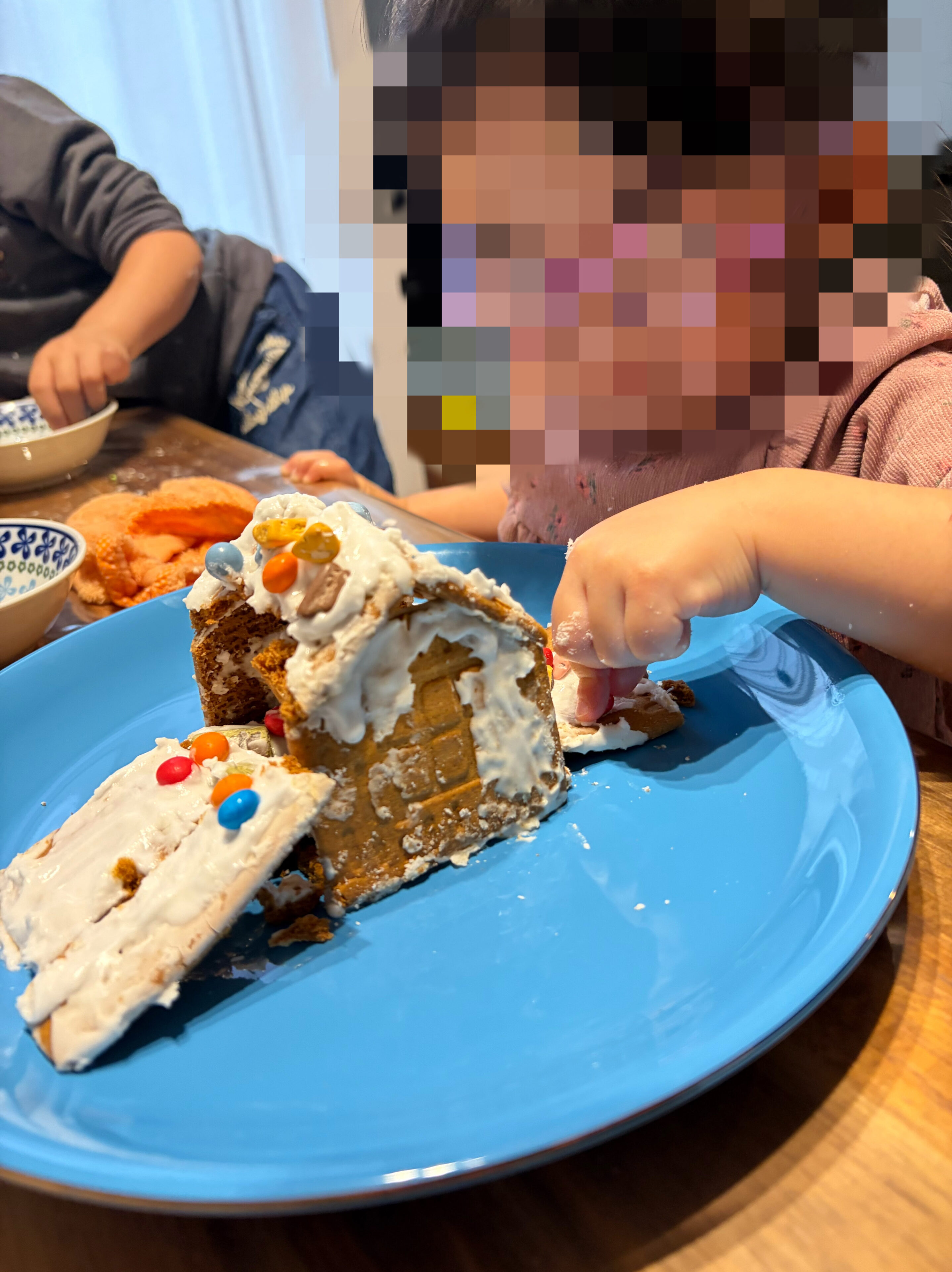 一方の2歳娘はというと。加減が分からないお年頃なので、飾り付けの最中に……『ガシャーン!!!』はい、お家、見事に屋根が破壊(笑)せっかくの白川郷が……!でも、これもまた「今」しか見られない思い出。屋根が壊れても、なおデコレーションし続ける娘。「あーあ!」と言いながらも、夢中にお家づくりを楽しめて良かったです。