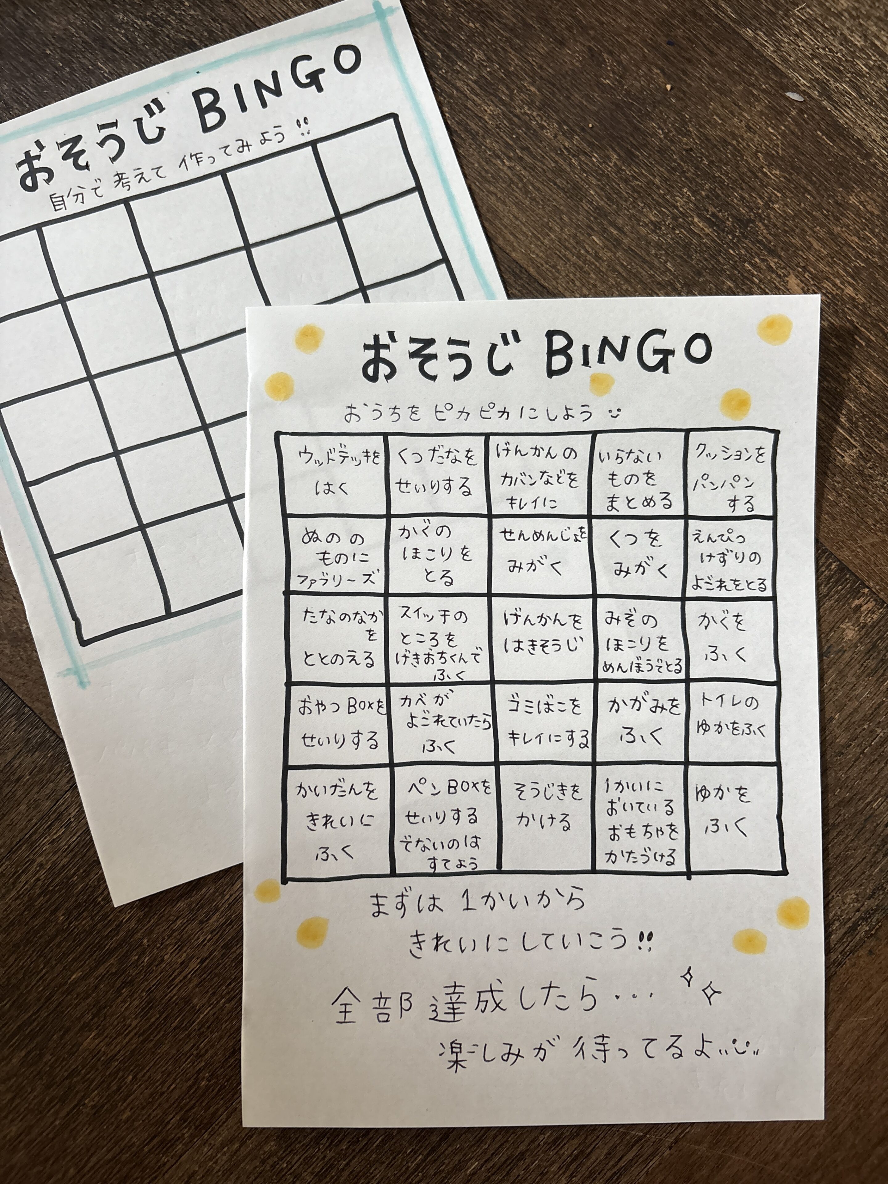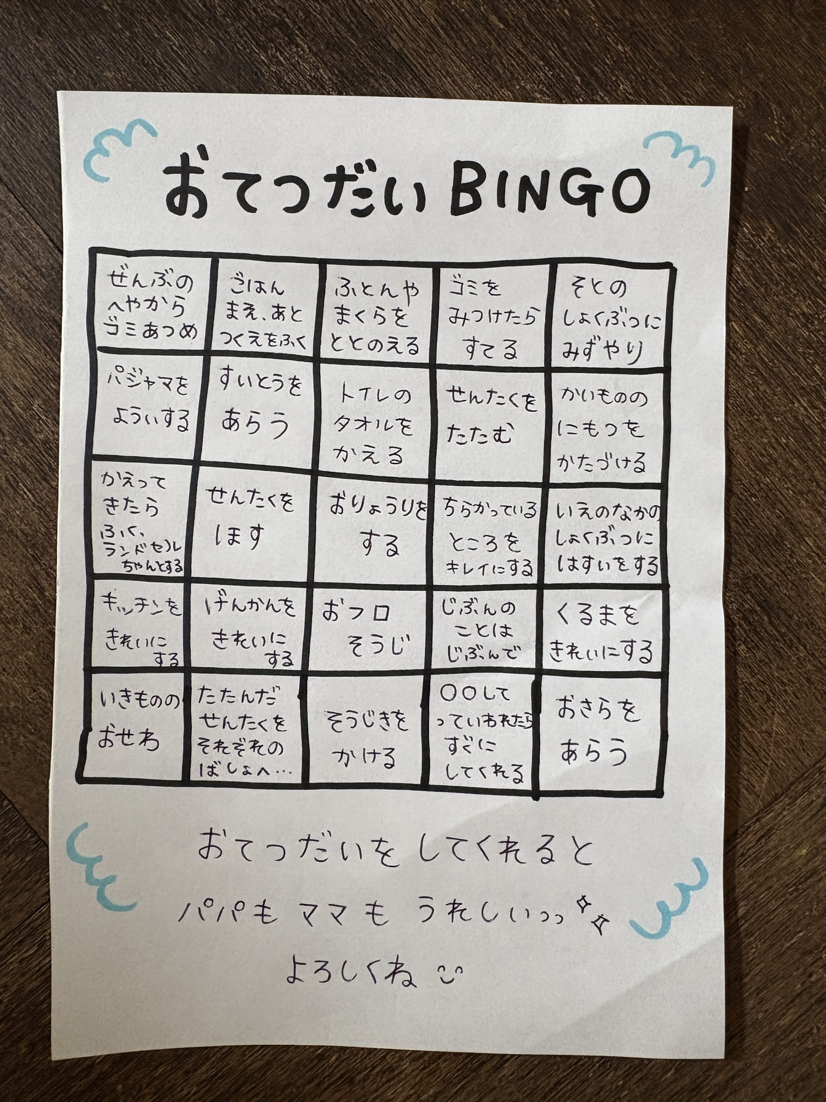 これはまだ内緒ですが、ビンゴしながら楽しくお手伝いや、お掃除をしてもらおうと思います。