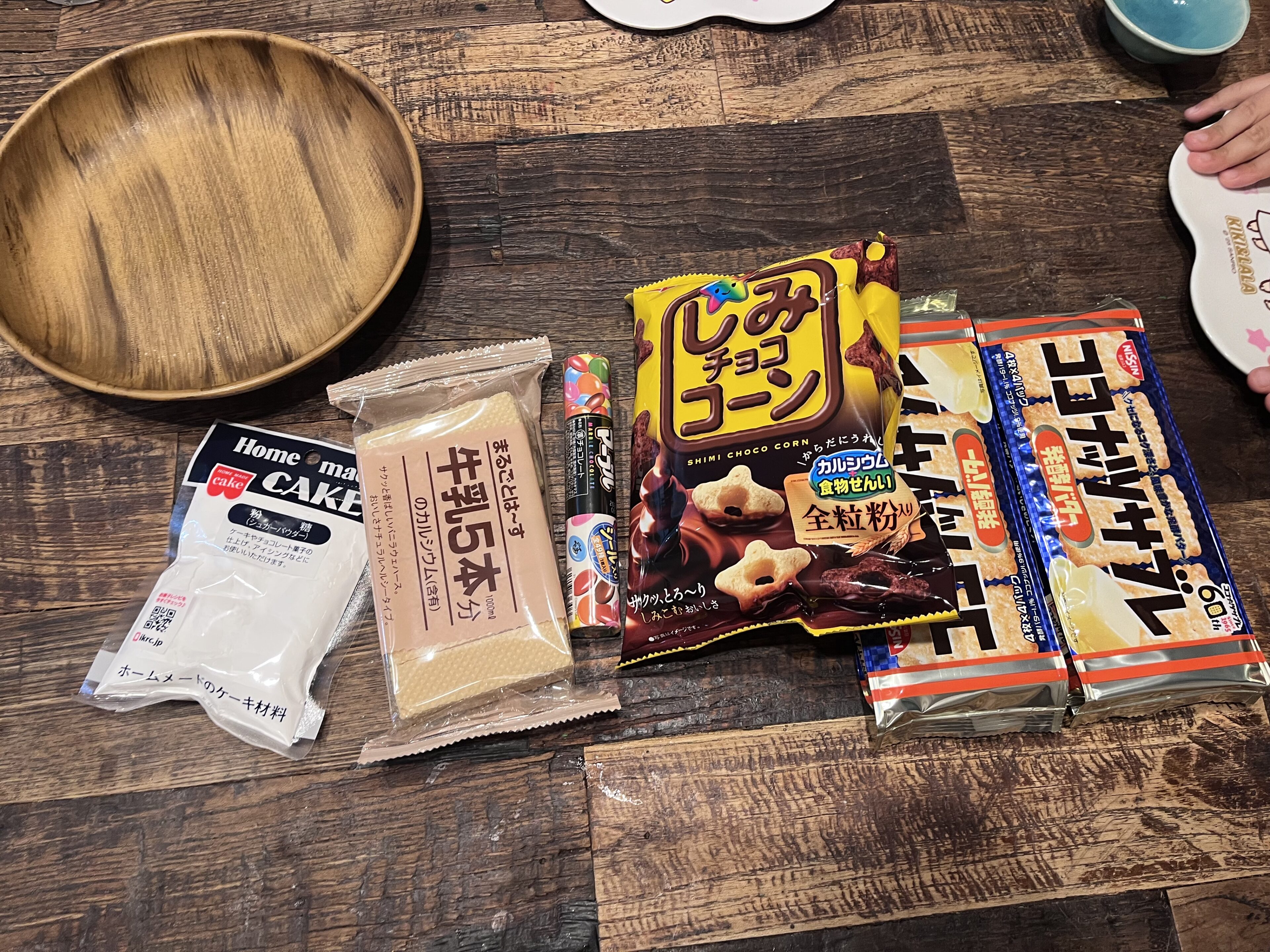 お菓子の家作りキットも販売していますが、今回は市販のお菓子で作ってみました。