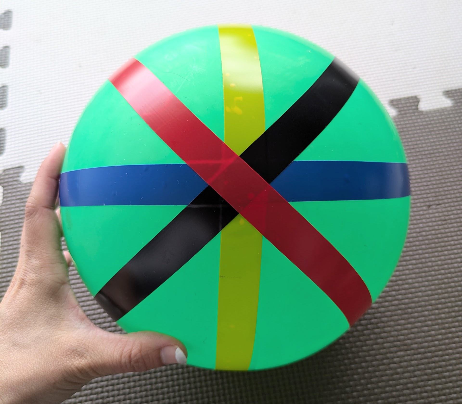 作り方はとっても簡単で、風船をふくらませ、カラーテープを写真のように縦横斜めにぐるりと巻くだけ。