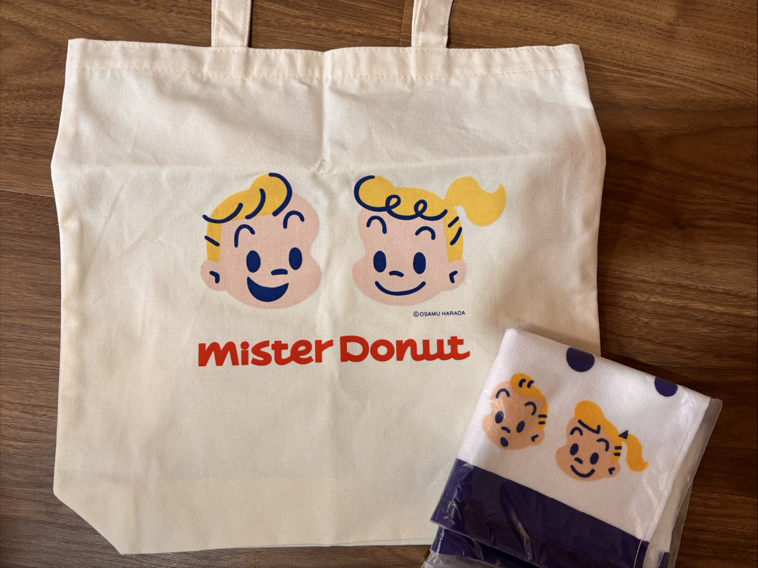 袋を開けた瞬間、まず目に飛び込んできたのが原田治さんデザインのグッズたち。このシンプルでかわいい世界観、「昔ミスドに通ってた世代」にはたまらないですよね。私は、よくピアノの練習のご褒美に母に買ってもらっていました!10ポイントを貯めて、原田治さんデザインのトートやお弁当などのグッズをもらうのを楽しみにしていたなぁと。なので、正直、「これはもうグッズ代だけで元取ってるのでは?」と思うくらいテンションが上がりました。