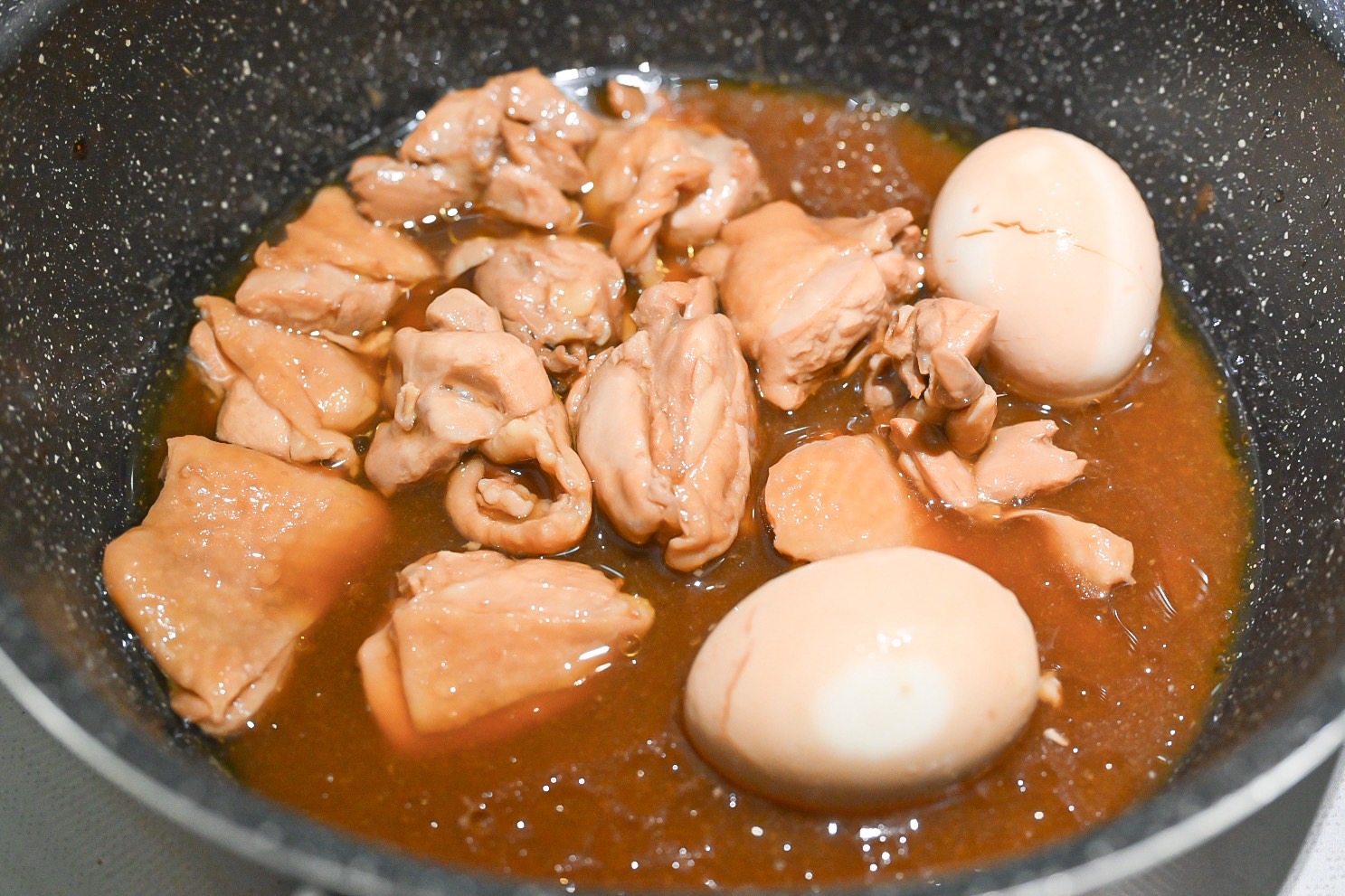 (4)ゆで卵を加えて煮汁をからめる