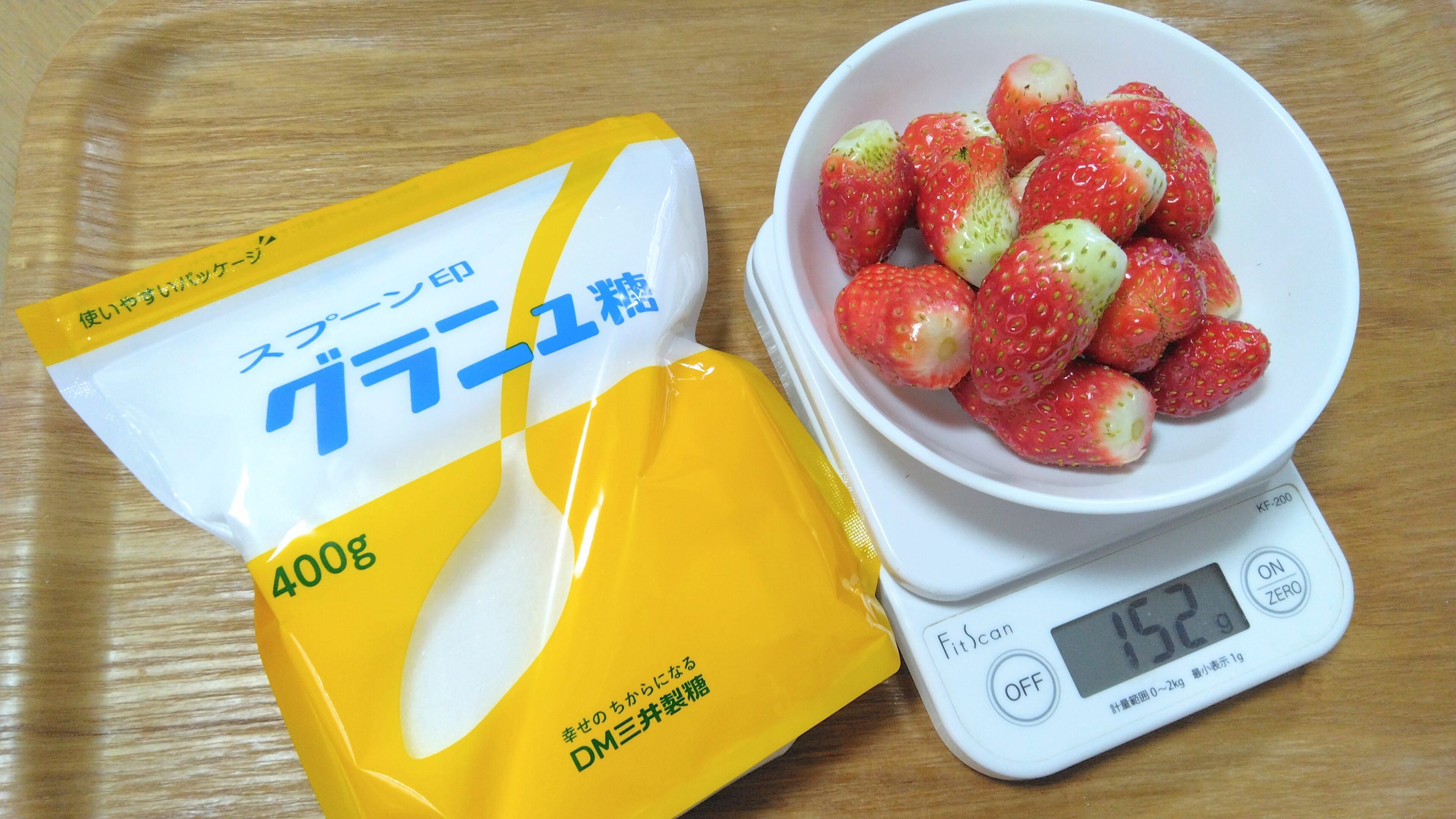 飴の材料は、グラニュー糖200gに対して水80ml。飴を絡めやすく、作りやすい分量です。参考にしたレシピではいちごを8個使用していますが、我が家では今回15個(150gほど)使用しました。多めに用意することをおすすめします。