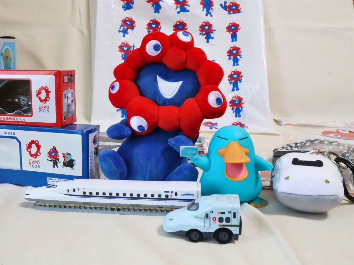 今回の福袋、「ミャクミャクのぬいぐるみが中心かな?」と思っていたのですが、開けてみてびっくり。電車・新幹線グッズがとても充実していました。