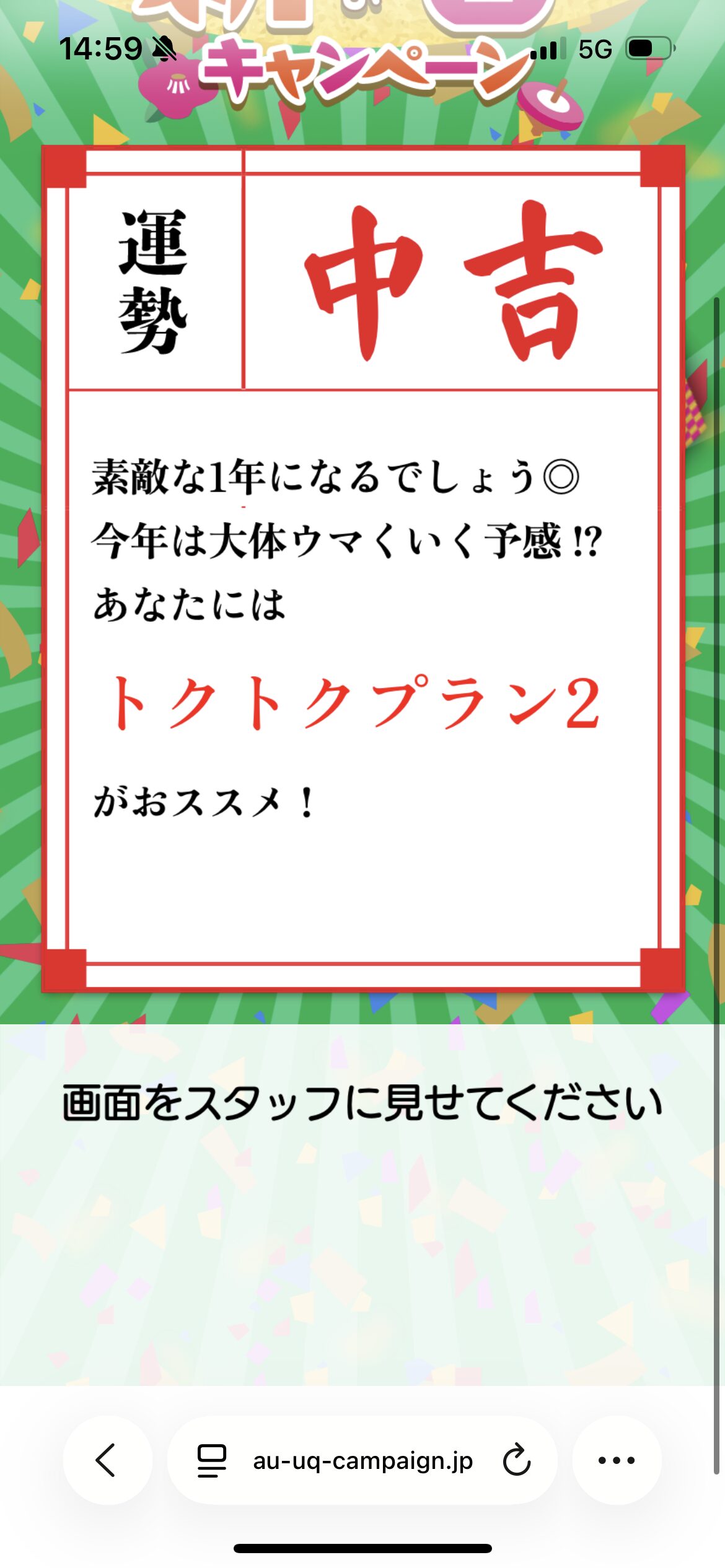 その後携帯の画面上でおみくじを引き、結果を店員さんに見せました。