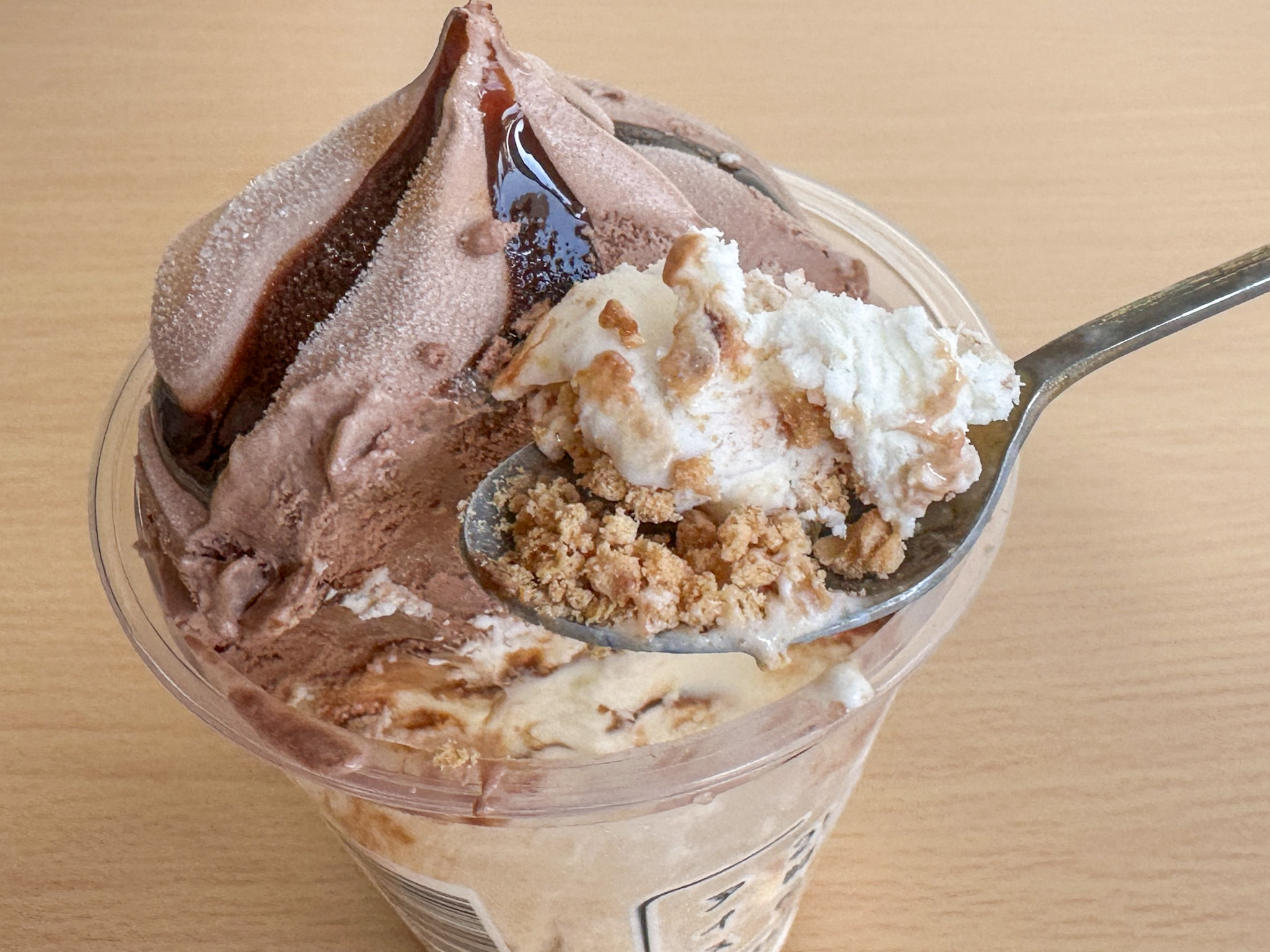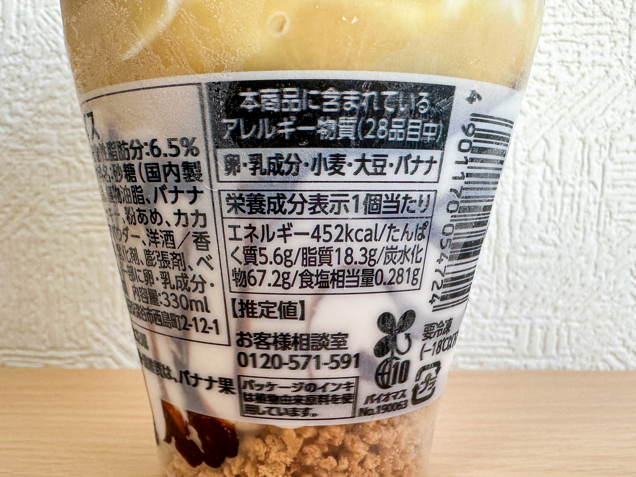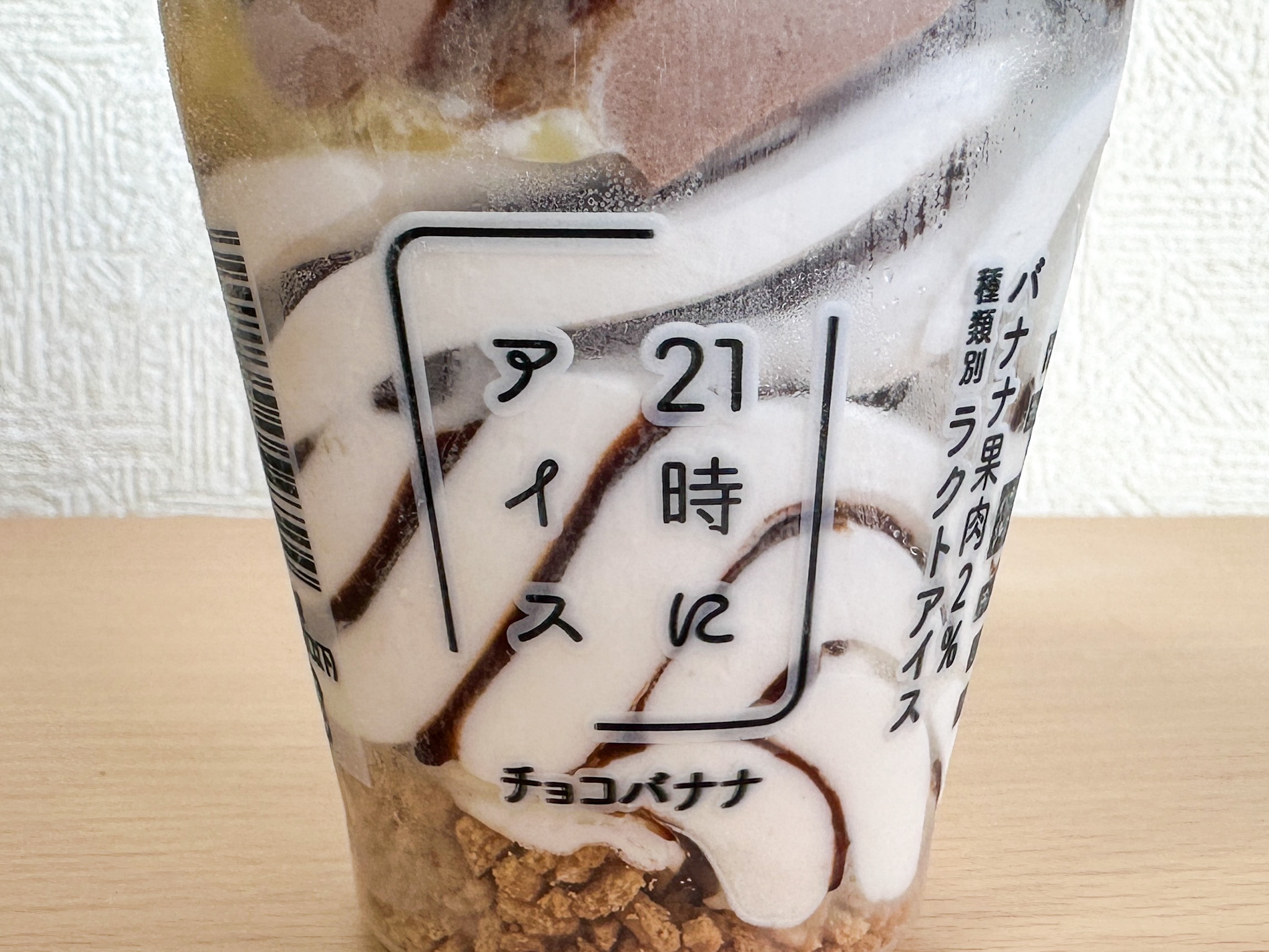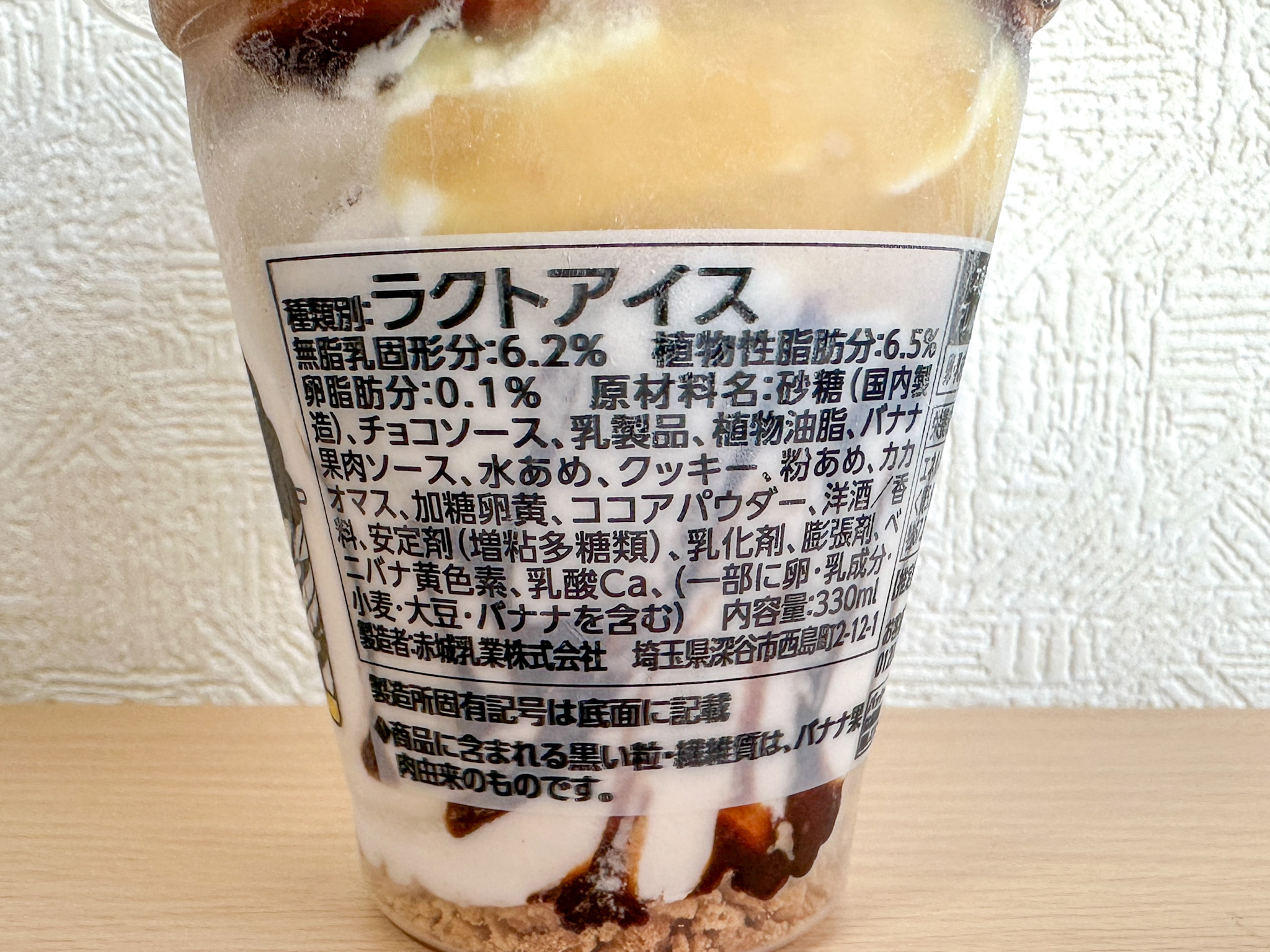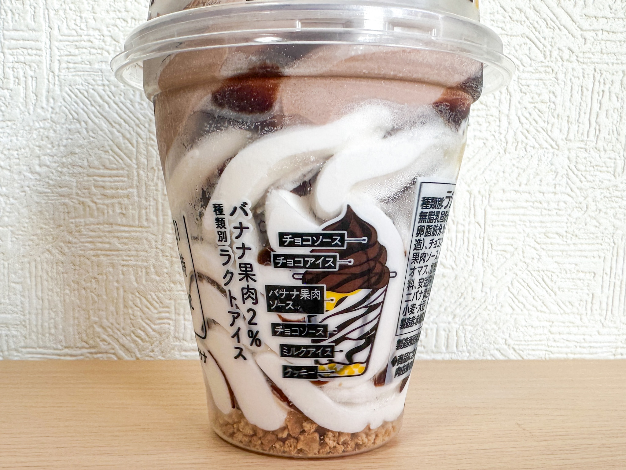 下から、クッキー、ミルクアイス、チョコソース、バナナ果肉ソース、チョコアイス、チョコソースと重ねた構成になっていて、食べる側を飽きさせないような熱い布陣。容量も330mlあるので、見た目も中身もボリューム満点です