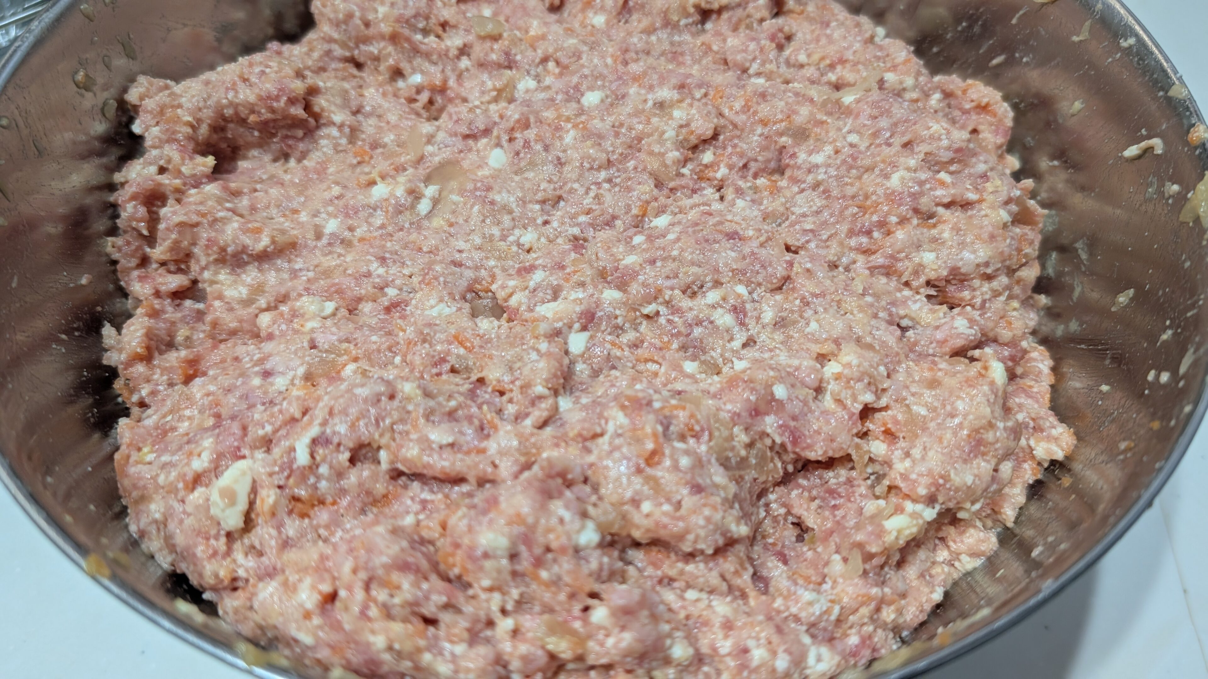 ⑵ 別のボウルにひき肉類を入れ(豚ひき肉を入れているのは、合いびき肉より安いからです笑)、木綿豆腐2丁(水切りなしでOK)、パン粉適量、たまご2個、牛乳適量(緩すぎないよう注意)、塩コショウ、ナツメグ(あれば)、人参(皮ごと生のまますりおろす)、⑴の玉ねぎを入れてよく捏ねる