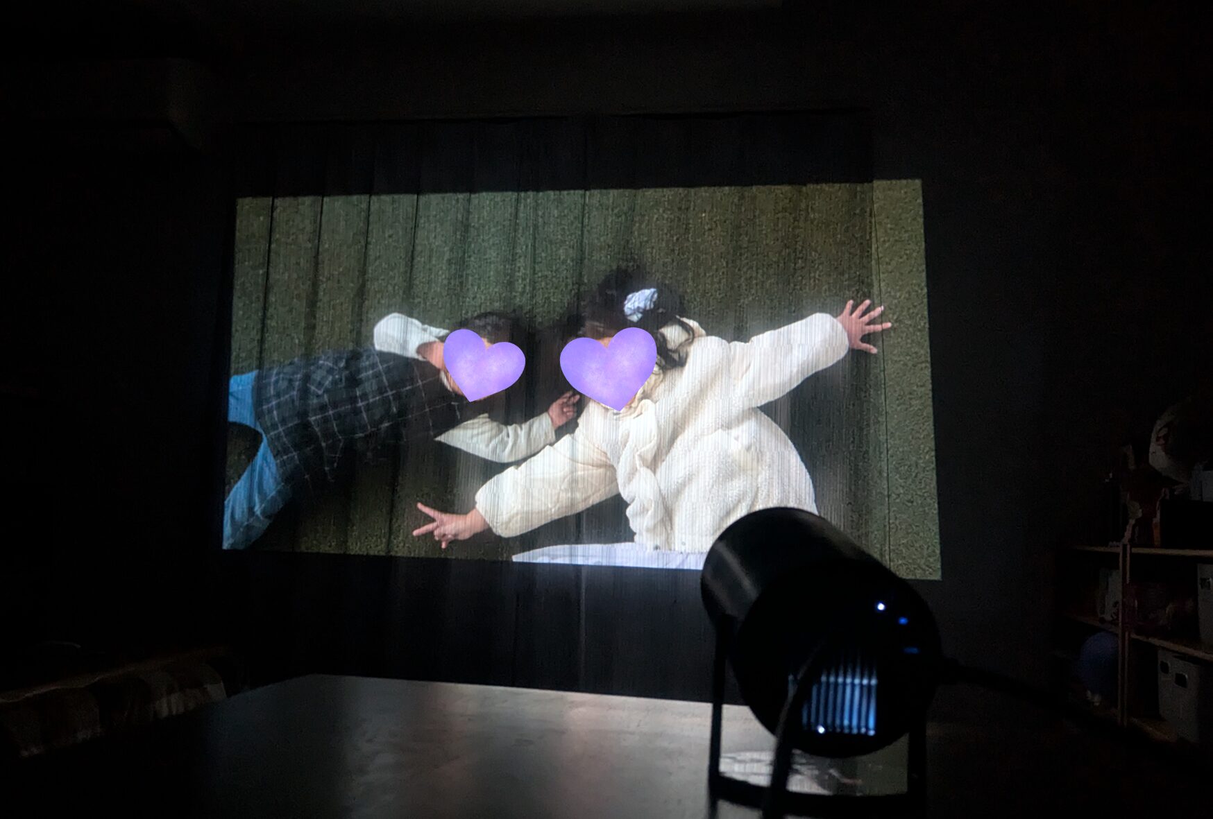 上の画像は、リビングにて3~4mほど離れたテーブルからカーテンに投影した様子です。