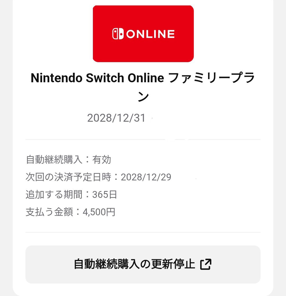 ニンテンドーeショップにて、小学生の息子が利用しているアカウントでNintendo Switch Onlineの「ファミリーパック」を購入した際のことでした。小学生になると、友だちとオンラインで遊ぶ機会も増えますよね。「まあ、必要経費だよね」と思いながら、いつも通り1年分を決済…のつもりでした。が、決済画面の反応が遅く、決済ボタンを複数回押してしまいました。