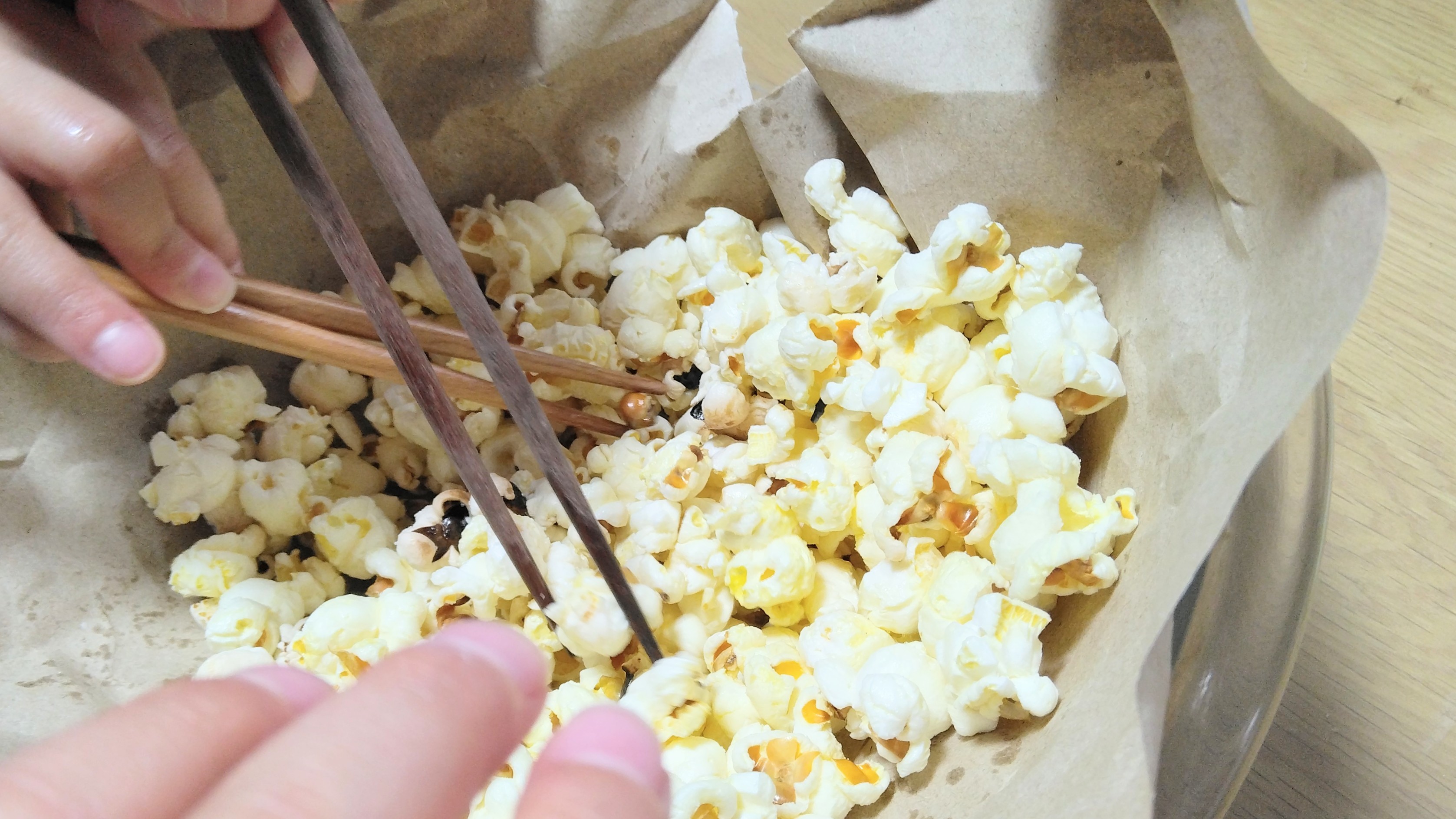 そして加熱してからの時間は大盛りあがり。耳を澄ませ、目を見開いて、最初のポン!からポンポンポンポン!と弾けだすと大人も子どももテンション爆上がりです。5分ほどで、できたてホカホカポップコーンの完成です。