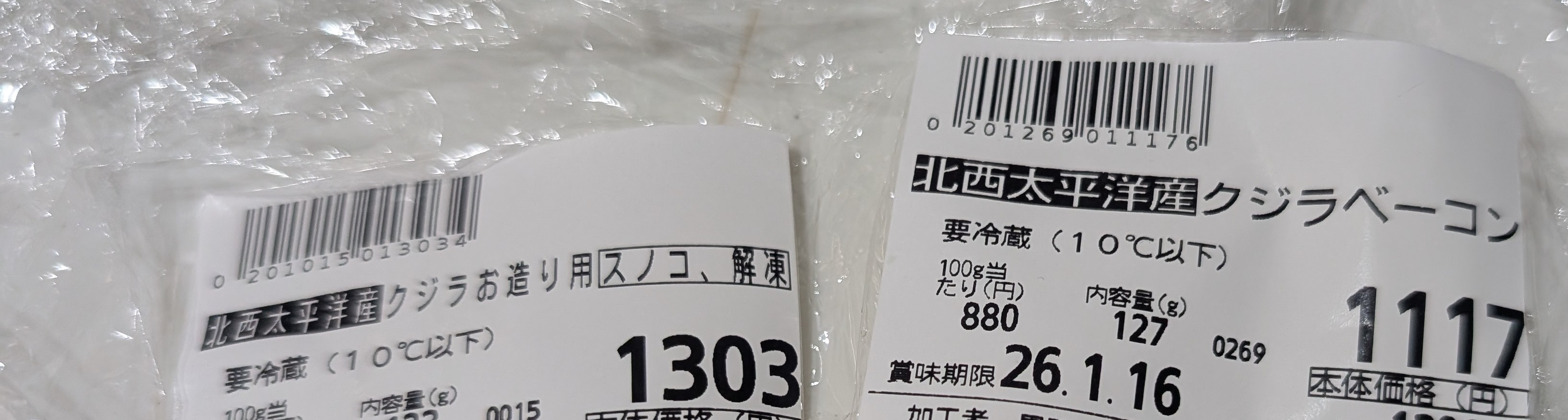 購入した「鯨ベーコン」「鯨のお造り」