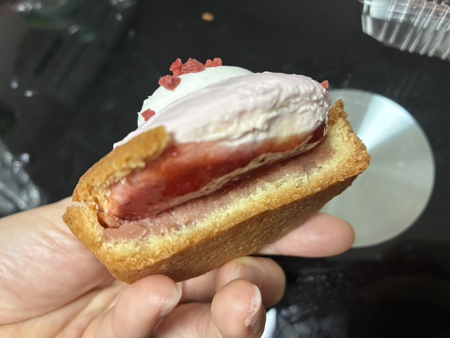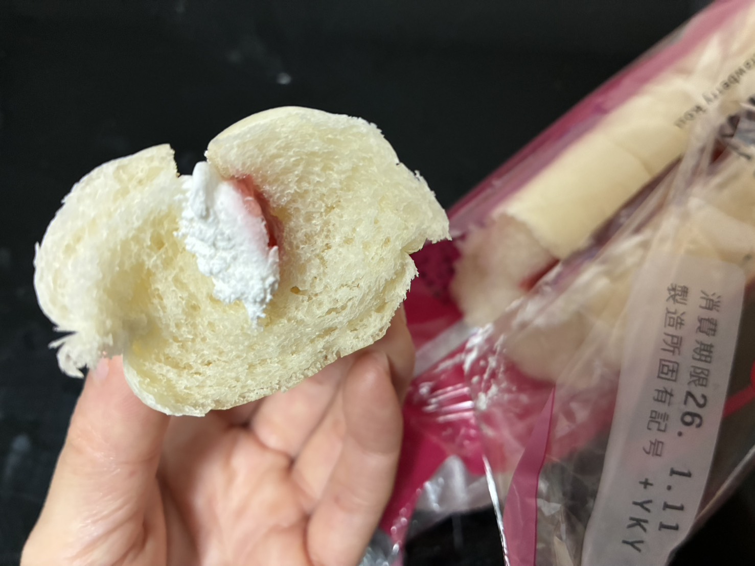 お餅のような超もっちり生地で、手でちぎれないくらいびよ〜んと伸びます!中のクリームは爽やかな酸味があり、少しチーズのようなコクも。ただ、私はお餅系の食感が得意ではないので、個人的には低評価に…。