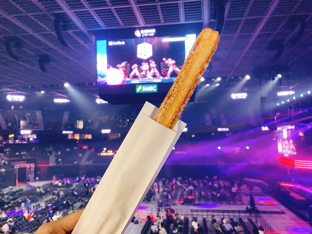 そ、そうか、D.LEAGUEって既にこんなに人気なものなのね、と思い知りながら中へ入ると、まるでアーティストのライブのような盛り上がり!グッズ販売にも行列が。中ではフードも買えて、我が子たちもチュロス片手に参戦です。