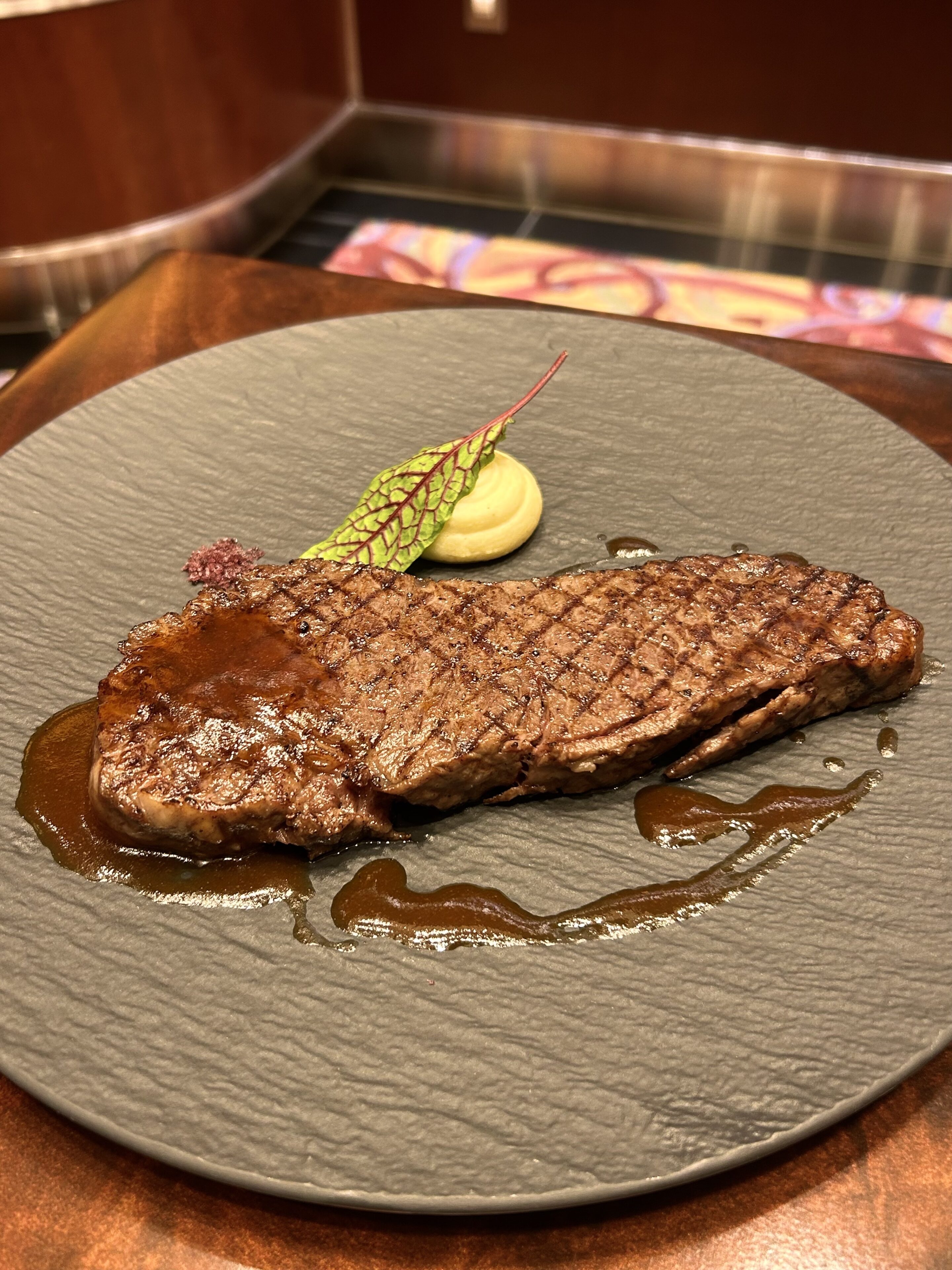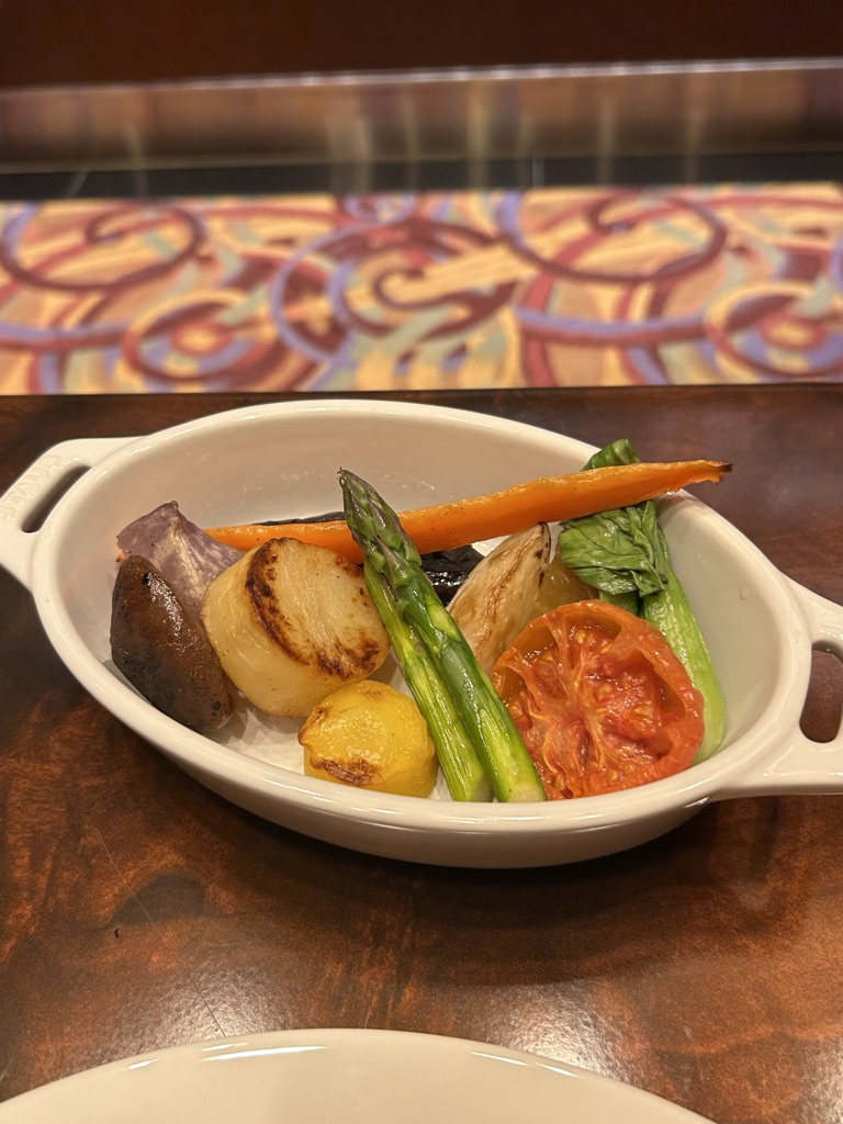 ボリューミーなリブロースを香ばしく焼き上げた豪快な一品で、付け合わせのローストベジタブルは高温でじっくりローストされ、野菜本来の甘味が引き出されていました。