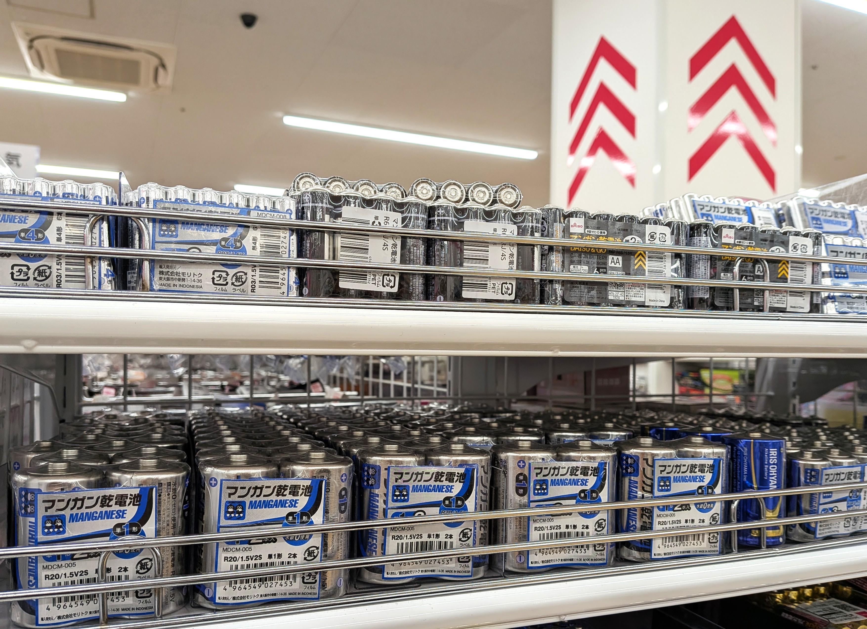 私が行ったダイソーには単一形から単四形までのマンガン乾電池がそろっていました。ダイソーさん、いつも助けられています。